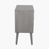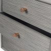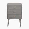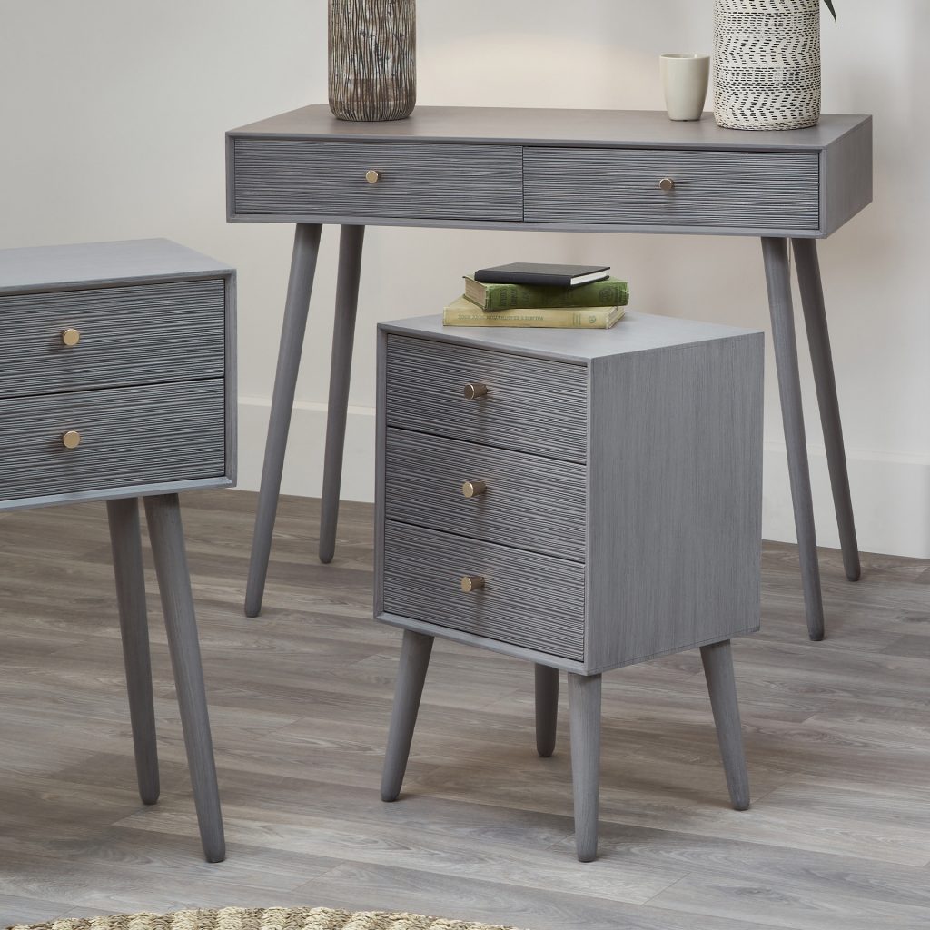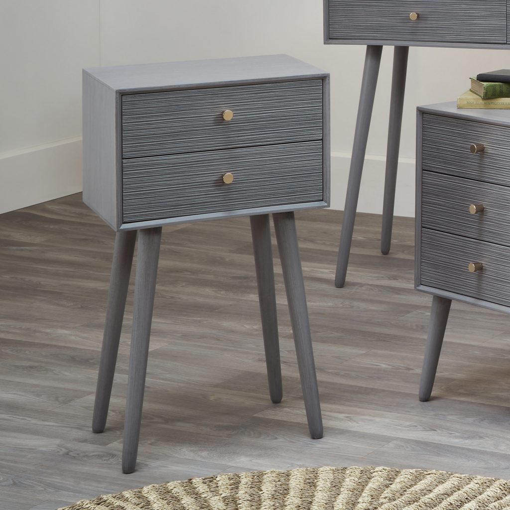A stylish and contemporary design, this bedside table is beautifully made with textured drawer fronts that add more interest but still keep its clean lines. These dark grey pine wood pieces coupled with their modern tapered legs and gold metallic handles, keep the look stylish and current.