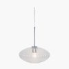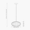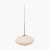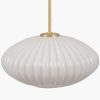 This Crystal Clear or Milky White glass oval pendant has a delicately ribbed texture and is finished with Silver or Gold metal detailing for a modern look.