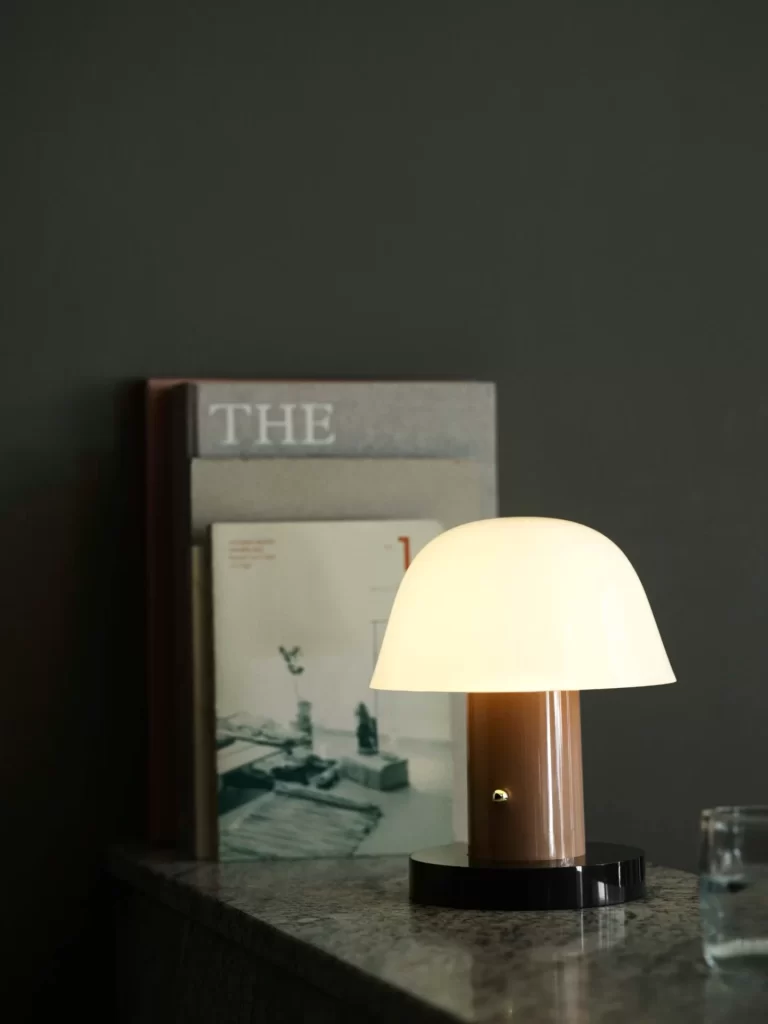 ‘Seta’ the Spanish word for mushroom sets the tone for the diminutive, mushroom-like proportions of this quirky table lamp. Delve deeper into Setago’s identity and a further clue can be found in the suffix ‘go’ as this lamp, unburdened by an electrical cord, can be placed in an infinite amount of locations. Additional design features include a discreet gold dimmer and a stylish upward curve on the lamp shade’s brim.