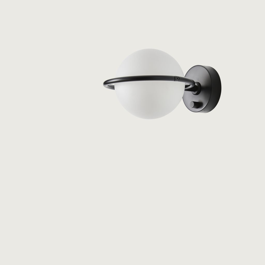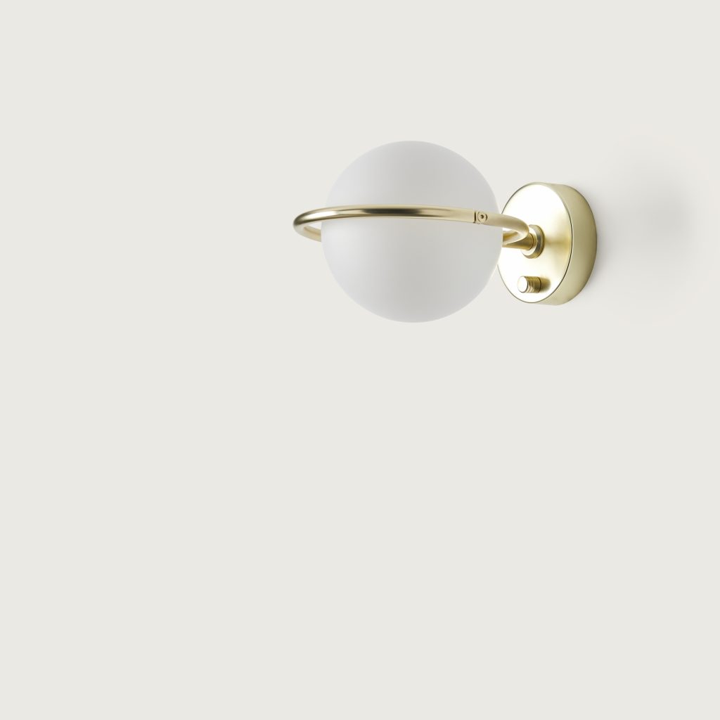 Abbacus is a metal wall lamp with blown opal glass, designed by Pepe Fornas for Aromas del Campo. Available in Matt Brass or Matt Black finishes. Bulb included. Switch on base.