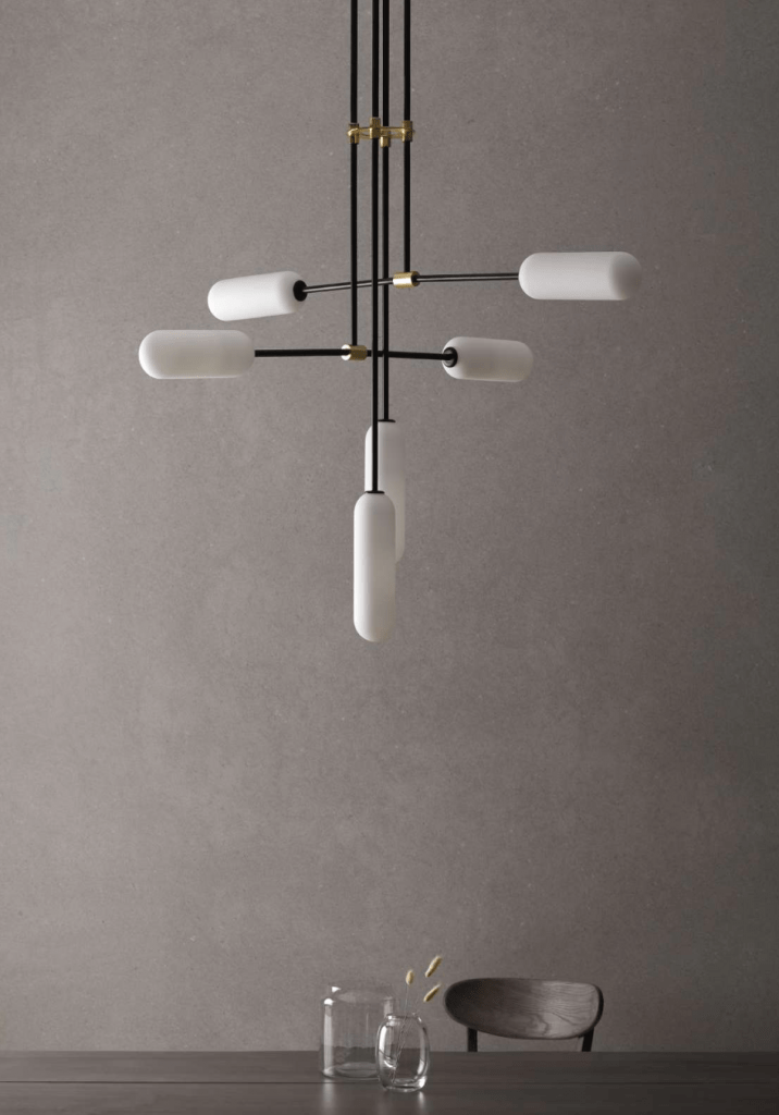 Atil ceiling pendant in Matt Black with Matt Brass details and Opal Glass Shades.