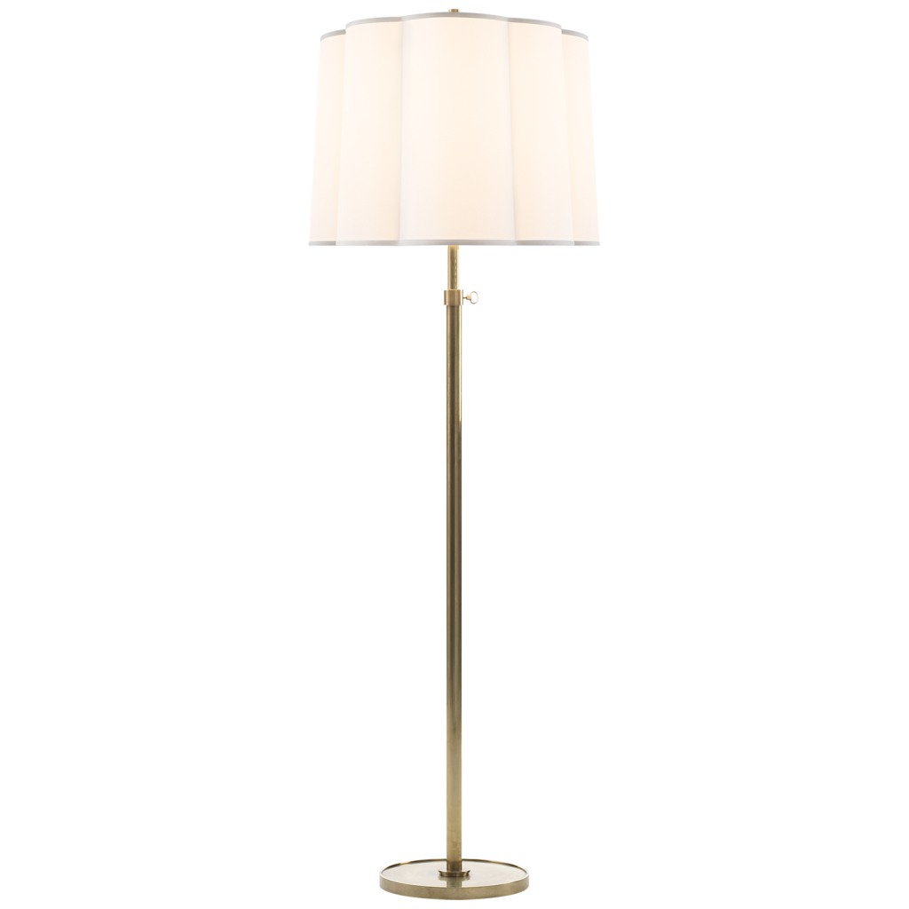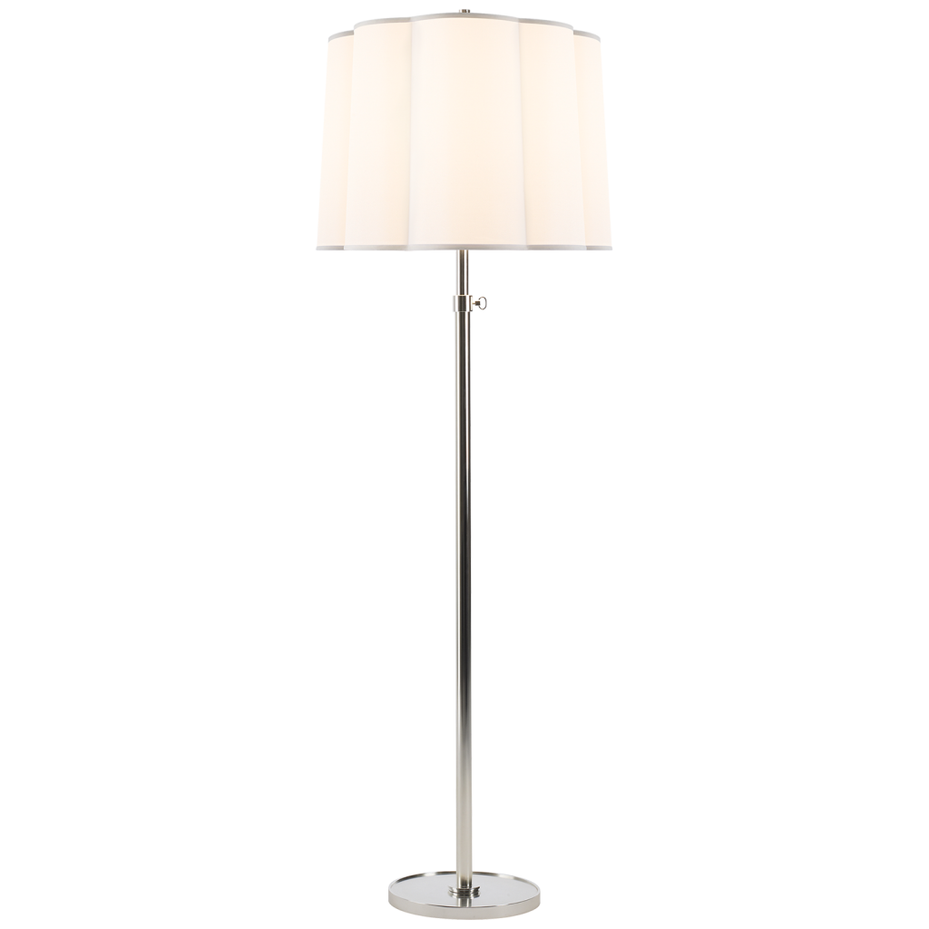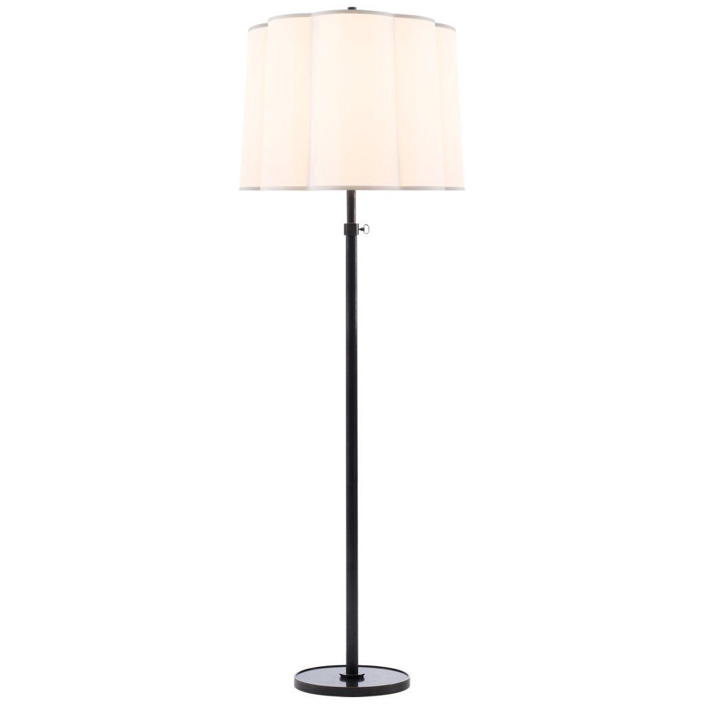 Simple Floor Lamp in Soft Silver, Bronze, and Soft Brass finishes with Silk or Silk Scalloped Shades.