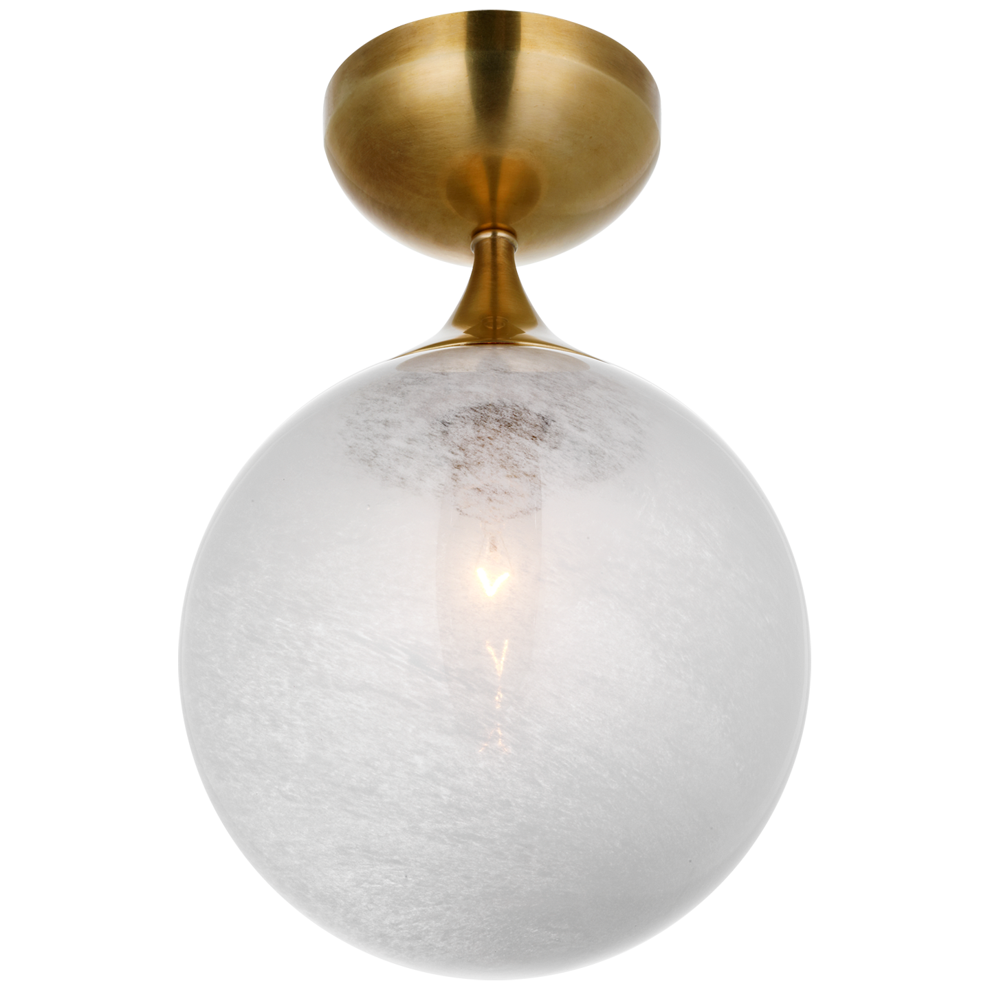 Cristol Small Single Flush Mount in Hand-Rubbed Antique Brass with White Glass.