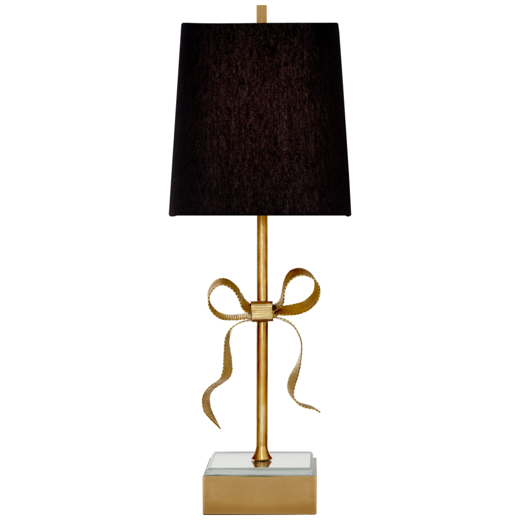 Ellery Gros-Grain Bow Table Lamp in Soft Brass and Mirror with Black Linen Shade.