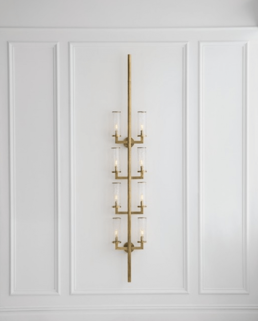 Liaison Statement Sconce in Antique-Burnished Brass with Crackle Glass. Requires Smaller Outlet Box.