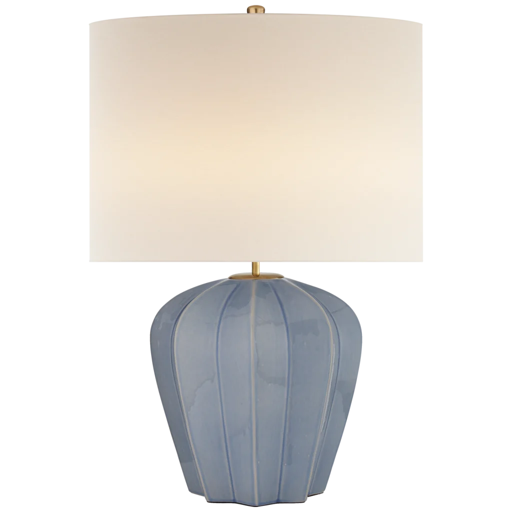 The Pierrepont by AERIN adds an artistic touch to any room. The rounded, scalloped base gives the impression of organic movement, while soft light from behind an oversized shade provides a warm and inviting glow for any living room.