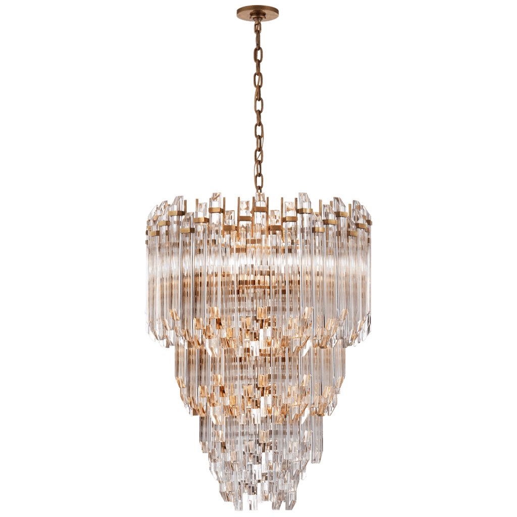 Adele Three-Tier Waterfall Chandelier in Hand-Rubbed Antique Brass with Clear Acrylic.