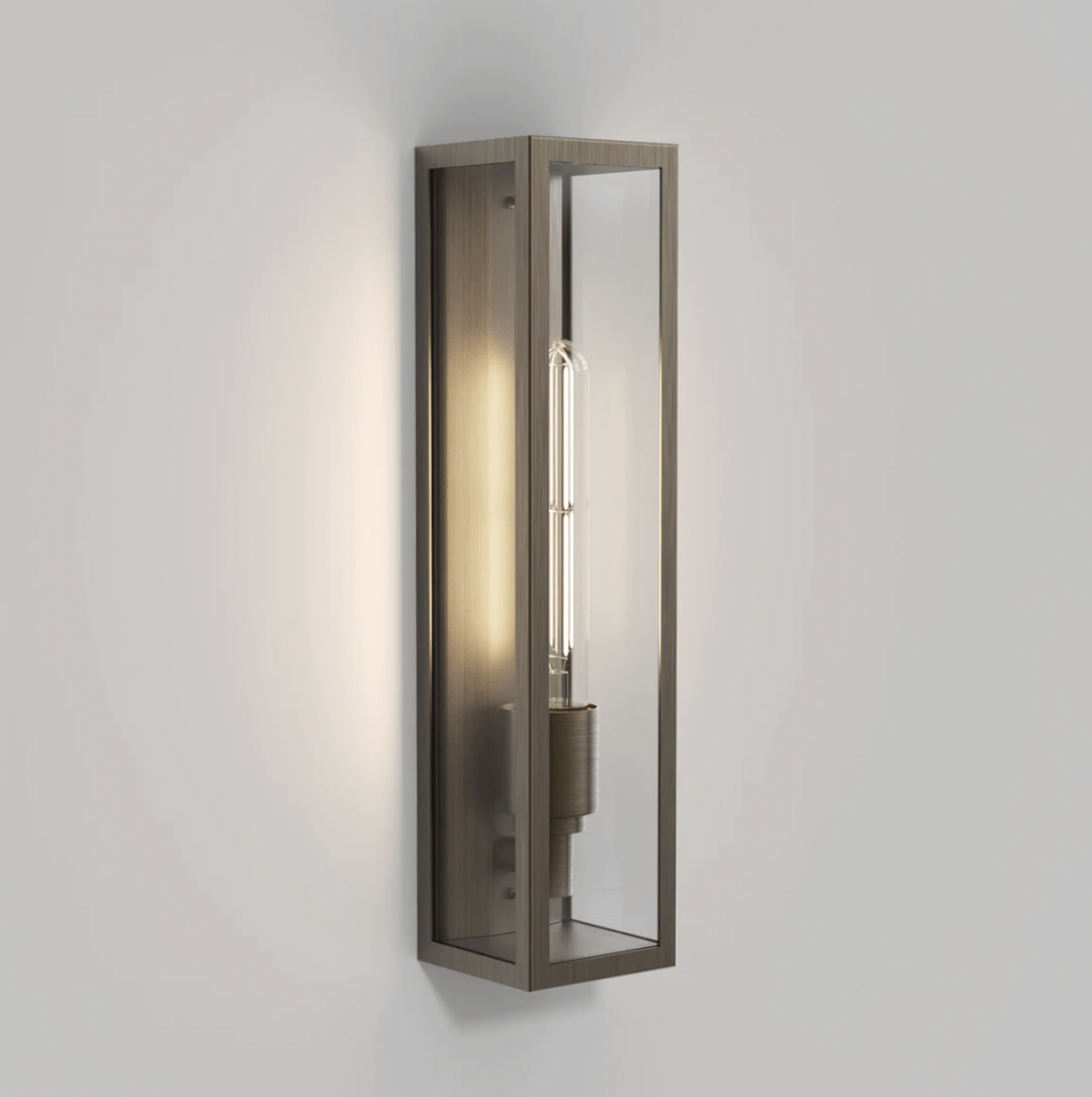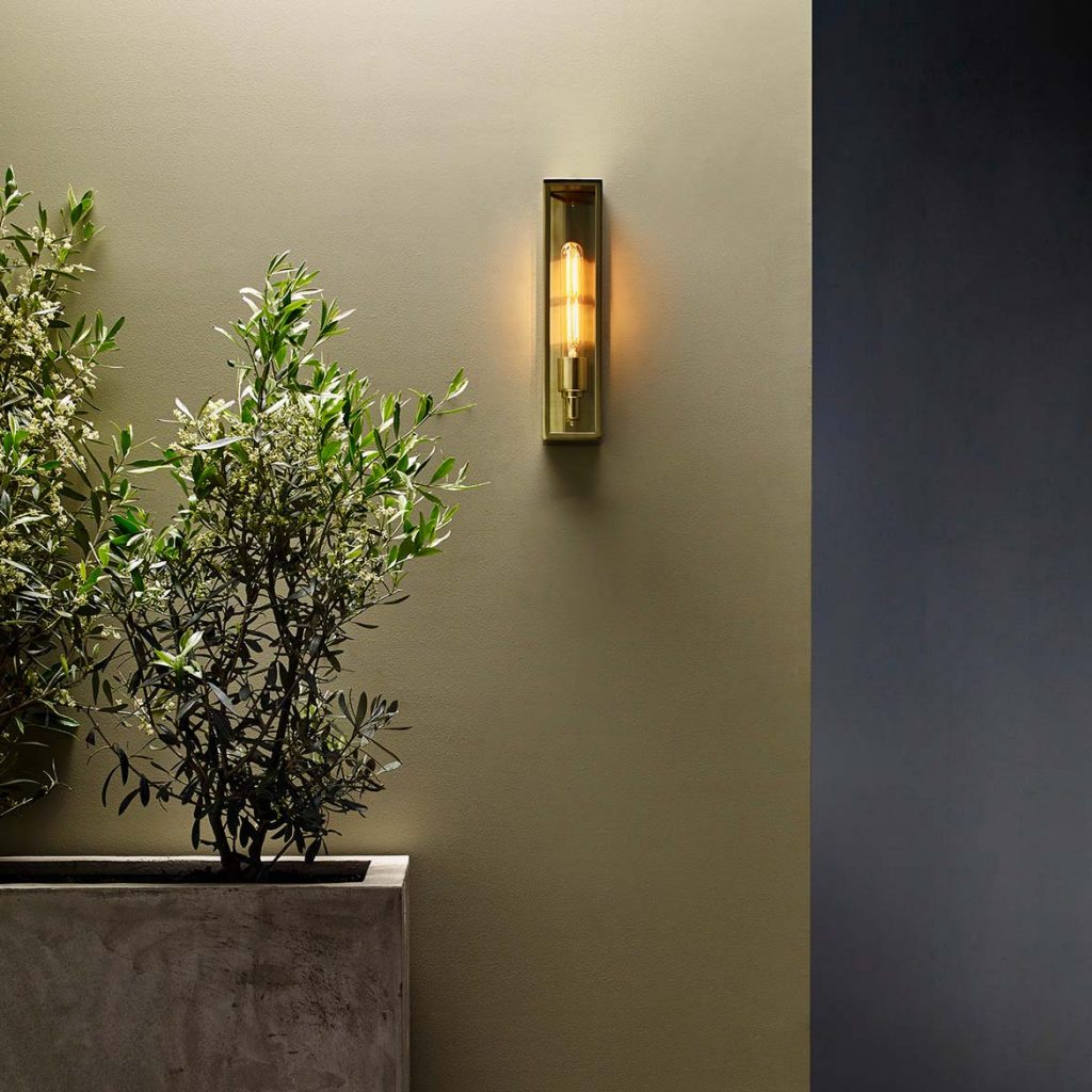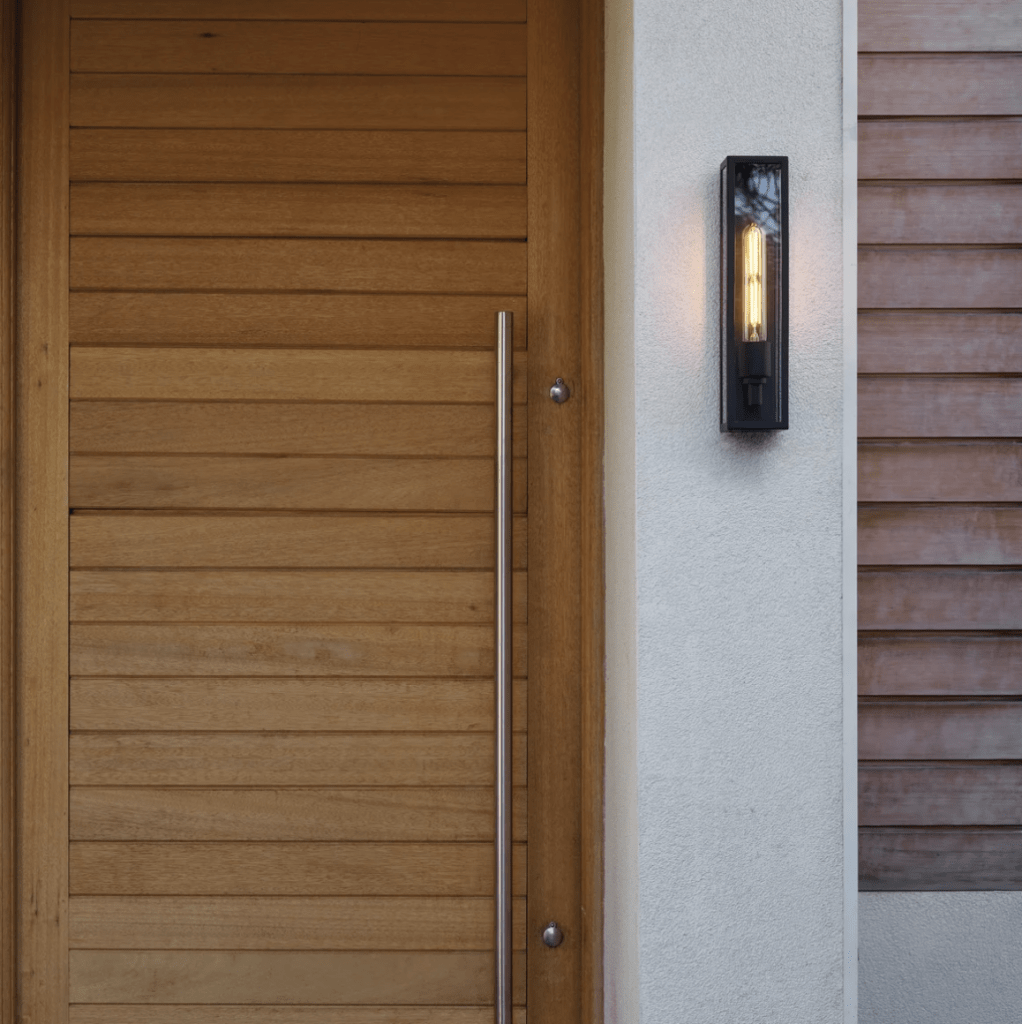 Harvard Exterior Wall Light in Bronze, Matt Black, Natural Brass or Polished Stainless Steel.