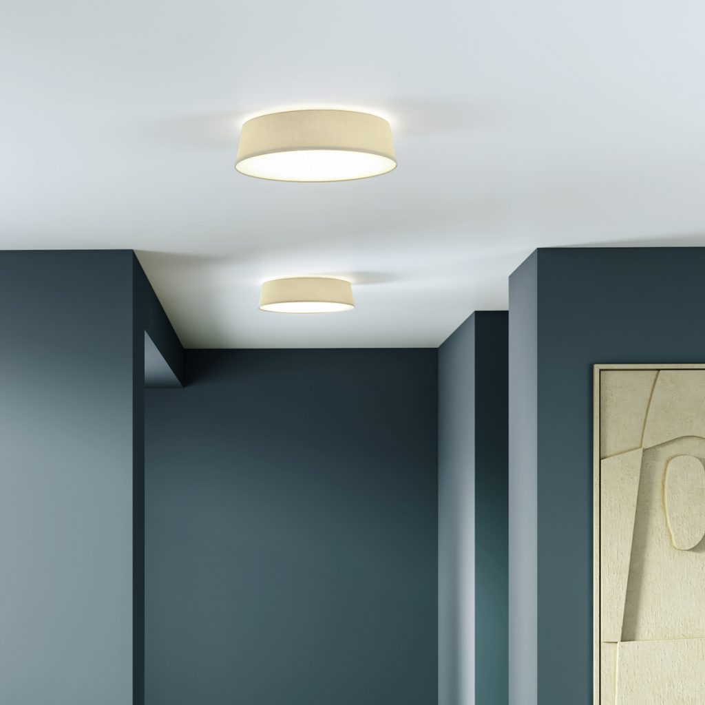 This simple, subtly tapered ceiling light fits effortlessly into any interior. The chamois diffuser and putty poly cotton shade create a soft ambient glow, attaching to a steel ceiling plate using magnets to enable easy removal for cleaning.