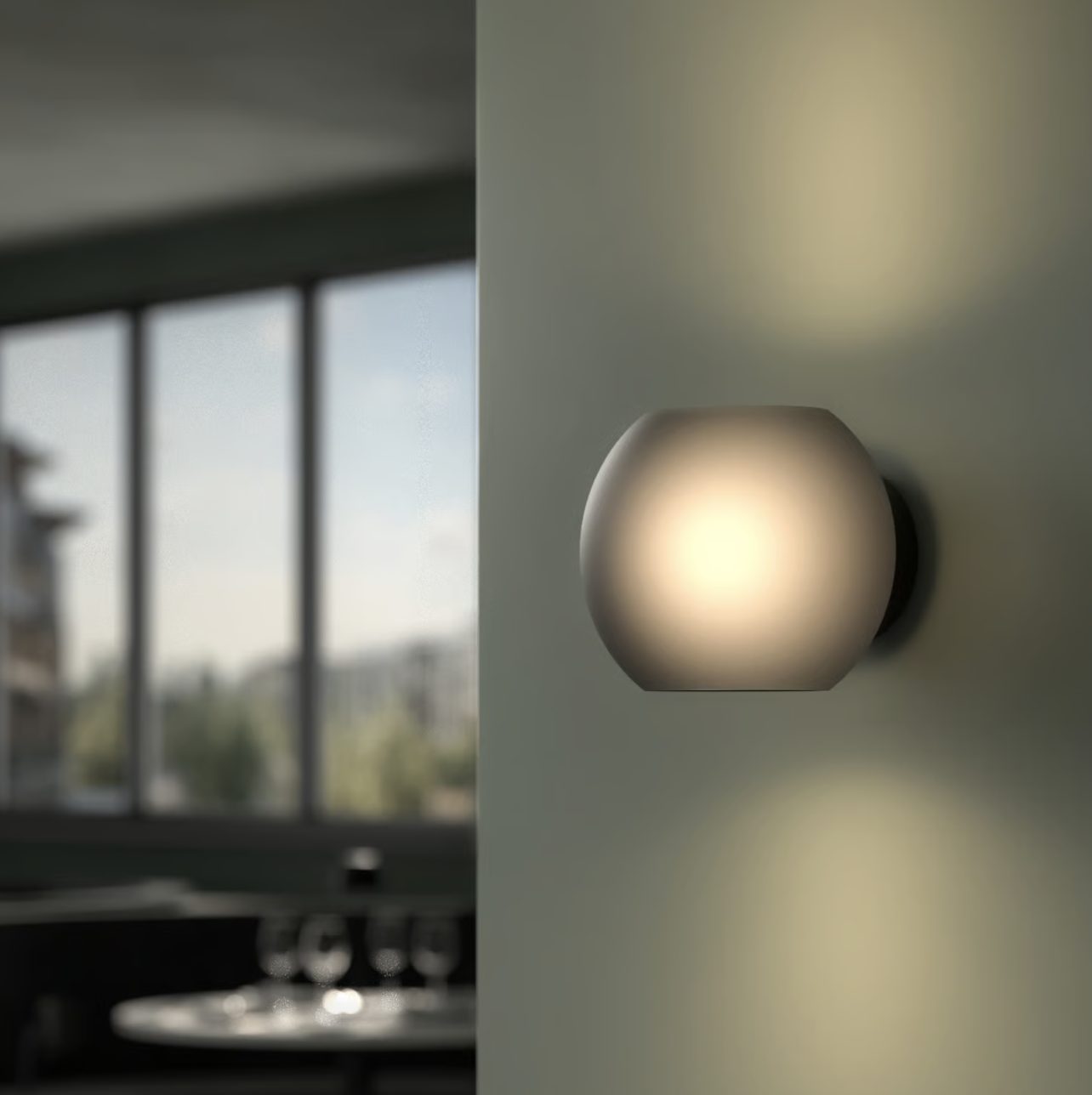 Luna is an interior wall light providing beautifully balanced illumination. Perfectly designed for living areas, its hand-blown glass shade with an acid-etched finish creates softly diffused light reminiscent of the subtle glow of the moon.