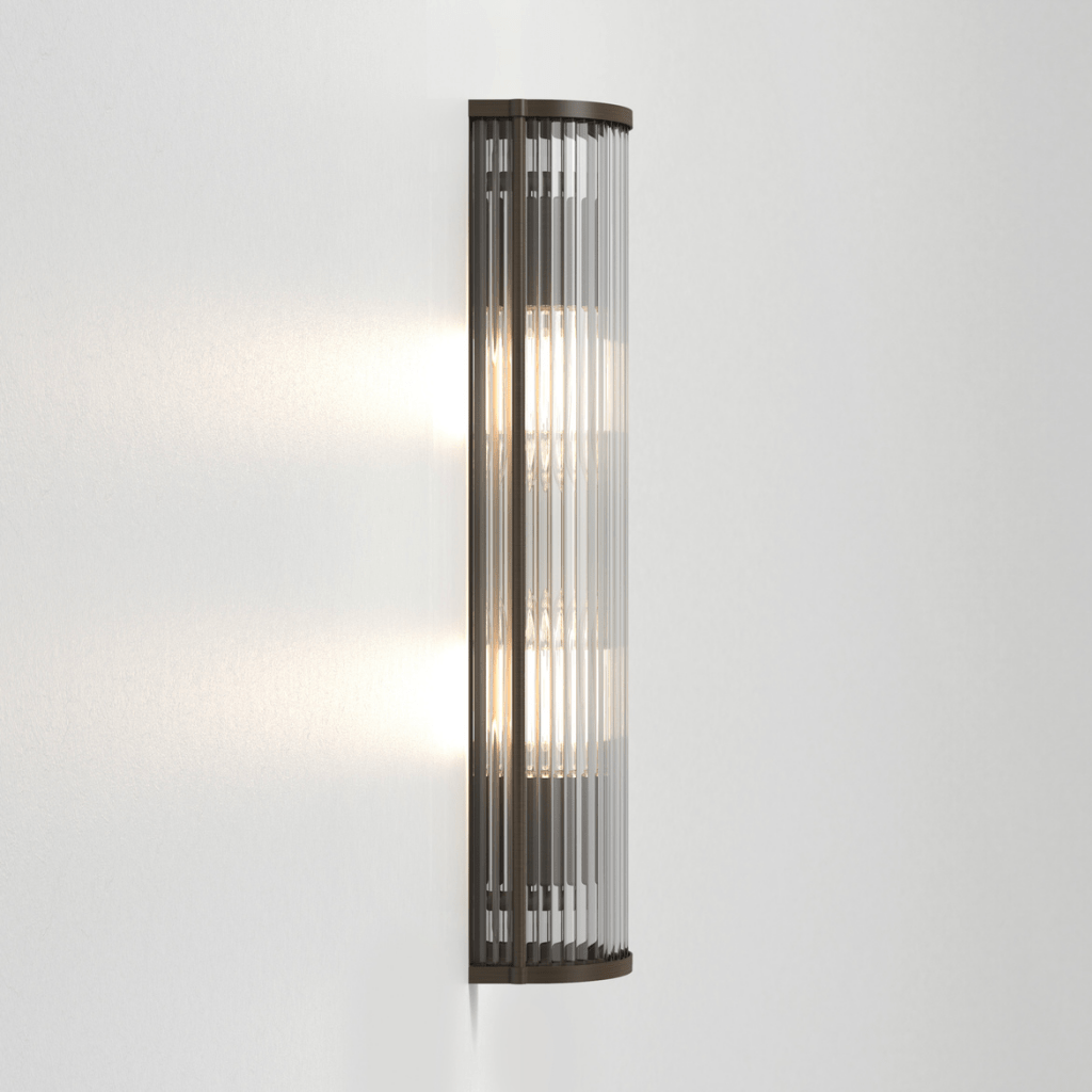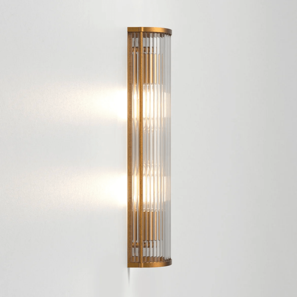 Inspired by Art Deco luminaires, the Avignon Round 525 wall light is large in scale adding instant drama and presence to a space. Tall and slender with a rounded profile, it features sparkling clear glass rods, die-cast antique brass end caps and exudes ambient, glare-free illumination. Designed with hospitality settings in mind, the light fixes to the wall with a single discreet screw, so nothing distracts from its seamless look.