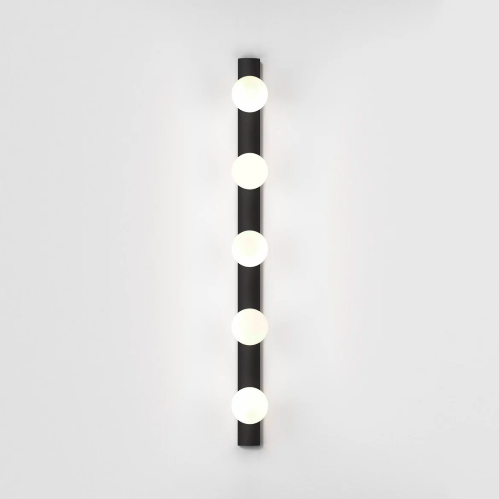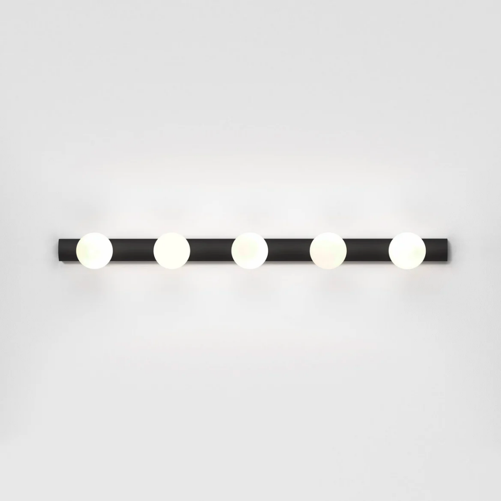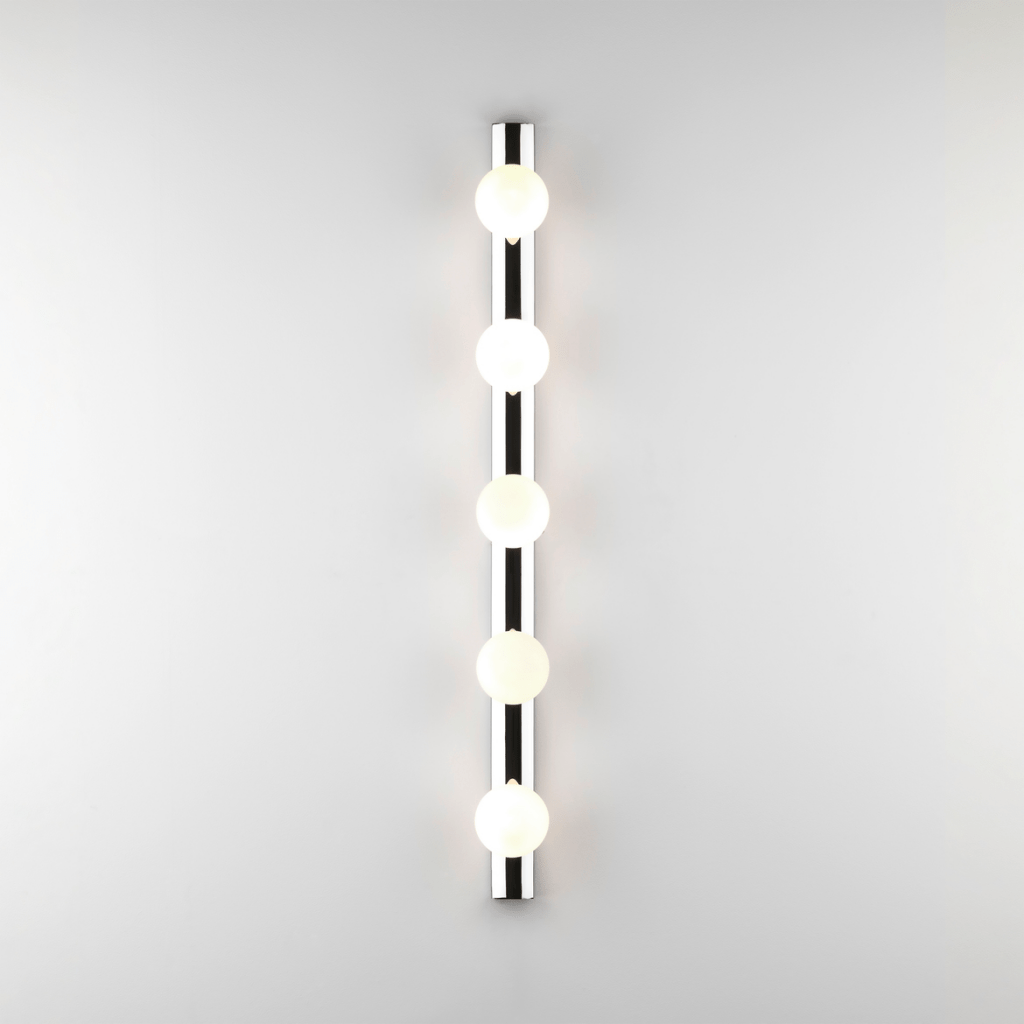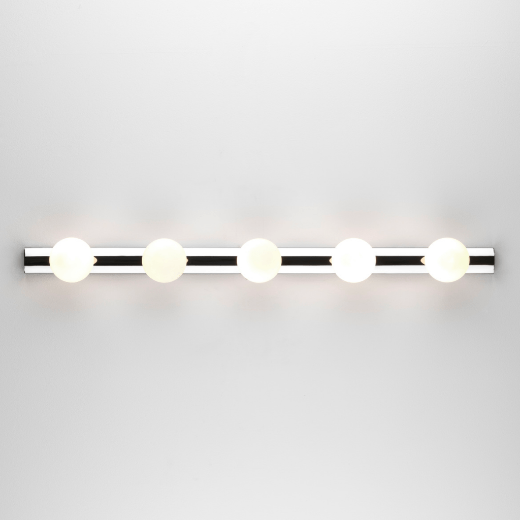 A contemporary take on the classic Hollywood mirror, this wall light features a slender polished chrome body and blown glass LED globes for bright, even illumination. Intended for bathrooms or dressing rooms, it can be positioned both horizontally or vertically around a mirror and comes unswitched to work seamlessly with integrated lighting schemes.