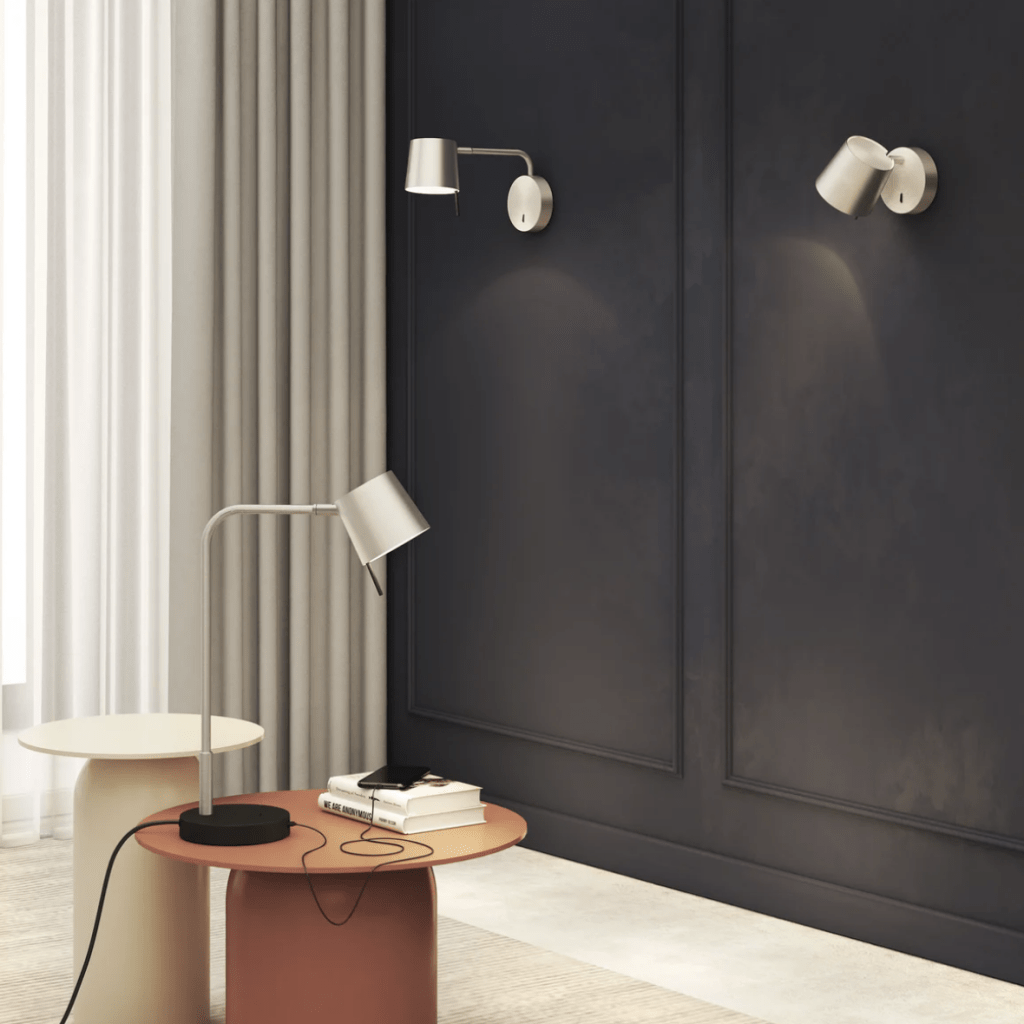 The Miura Wall is a timeless, supremely functional LED reading light ideal for guestrooms or office spaces. It features a custom-moulded diffuser for reduced glare and a hard wearing knuckle joint for easy adjustment. The shade, arm and base can be mixed and matched in matt nickel, matt black or matt gold.