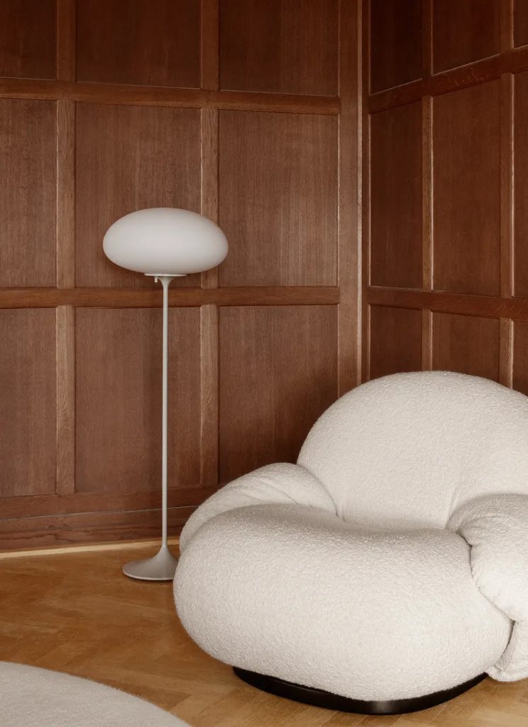 The Stemlite (1962) was the first ‘total look’ lamp, a pioneering new typology conceived by American Designer Bill Curry, which replaced the traditional base-plus-shade form with a single self-contained unit comprising interchangeable modules.