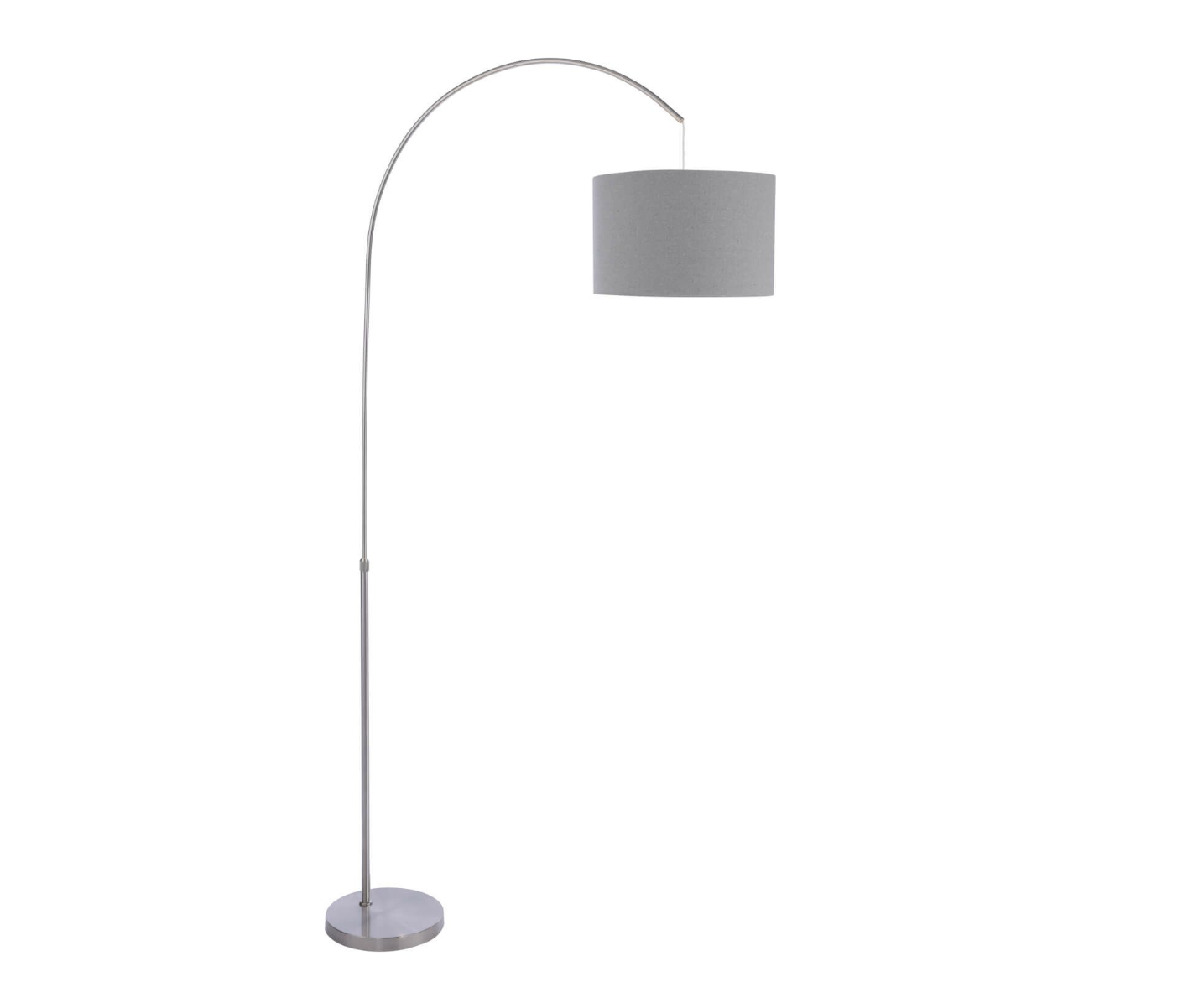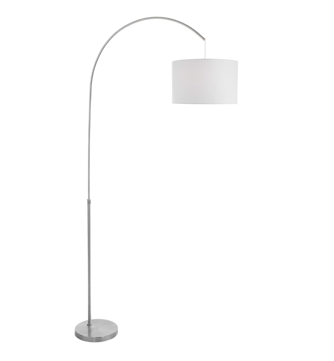 The Bow Floor Lamp cuts a striking silhouette, with its sleek satin nickel base and overhanging arm ready to illuminate your space in style.