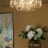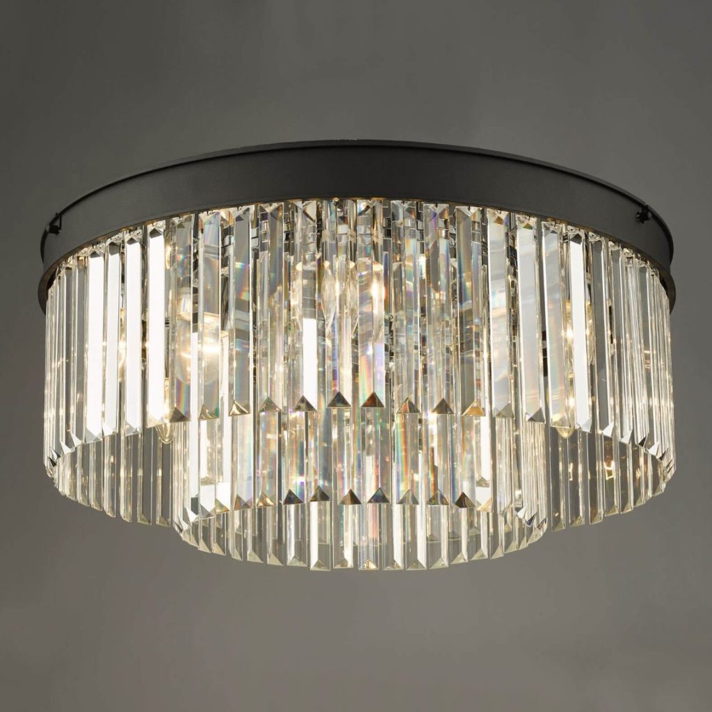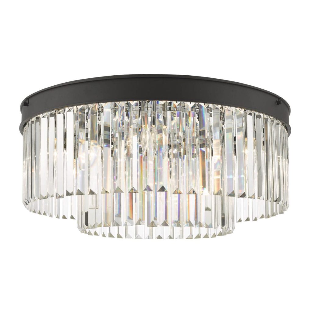 The Celeus 6 light flush ceiling chandelier is a stunning statement chandelier combining clear faceted crystal with a contrasting textured anthracite finish. Our designers have concentrated on keeping this fitting looking elegant and sophisticated. Special attention was made to obscure the crystal fittings with the anthracite frame.