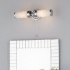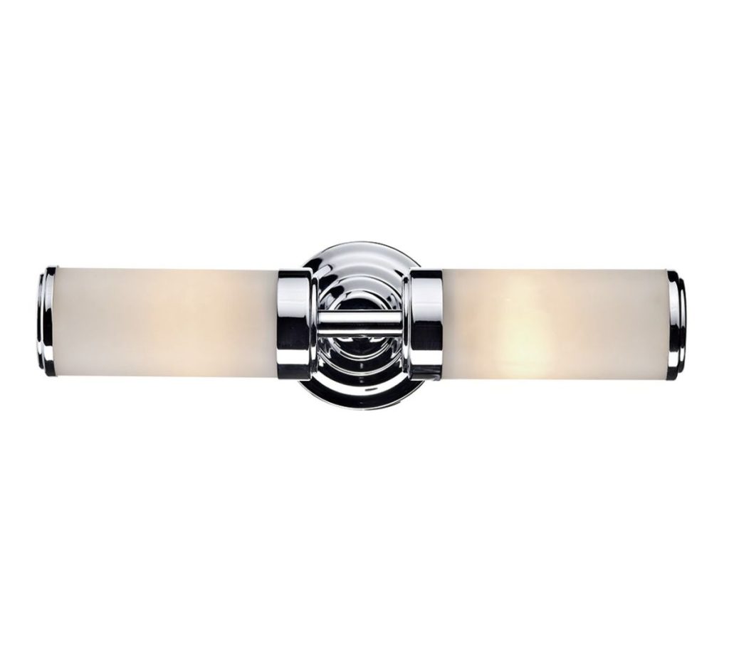 The CENTURY IP44 2lt Bathroom Wall Light has a ribbed polished chrome backplate and frosted glass shades.