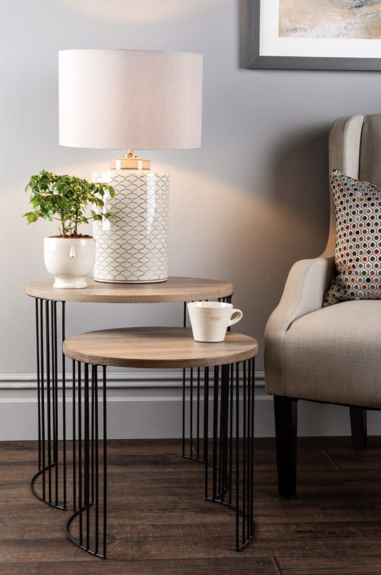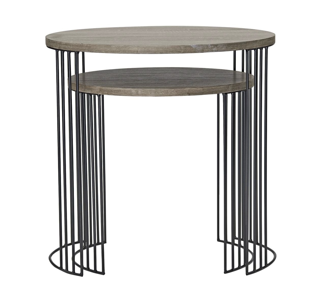 The stylish Drum nested tables with oak effect, featuring black metal legs; complete with a round, oak effect top. Ideal for saving space in any room, whilst providing a modern aesthetic.