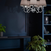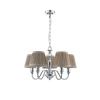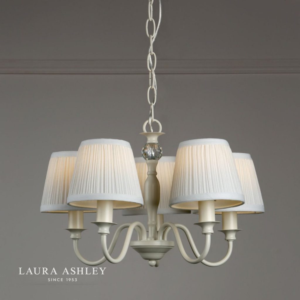 Laura Ashley 5 Light Ellis Chandelier in Satin-Painted Spindle with Ivory Shades or Polished Chrome with Grey Shades.