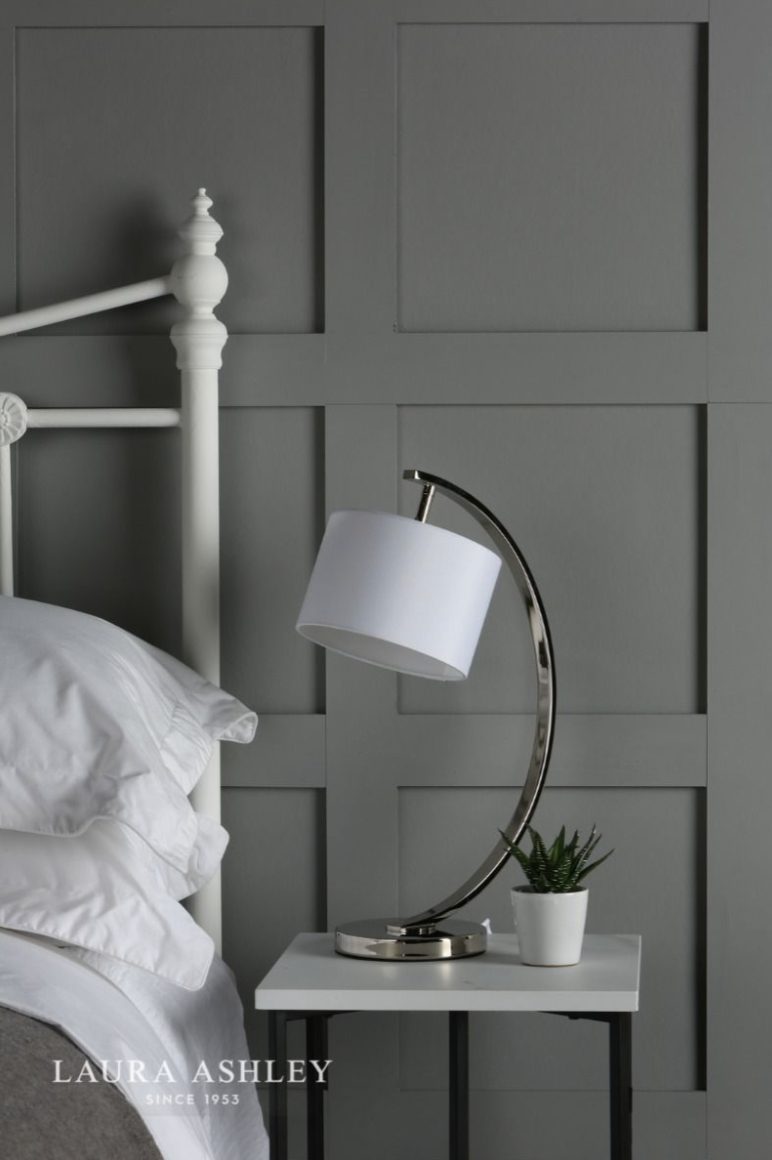 A thoroughly modern small table lamp, the Noah from Laura Ashley comprises a white slubbed linen drum shade held aloft by a curved ribbon stem, itself poised on a round base, all finished in velvety brushed chrome.