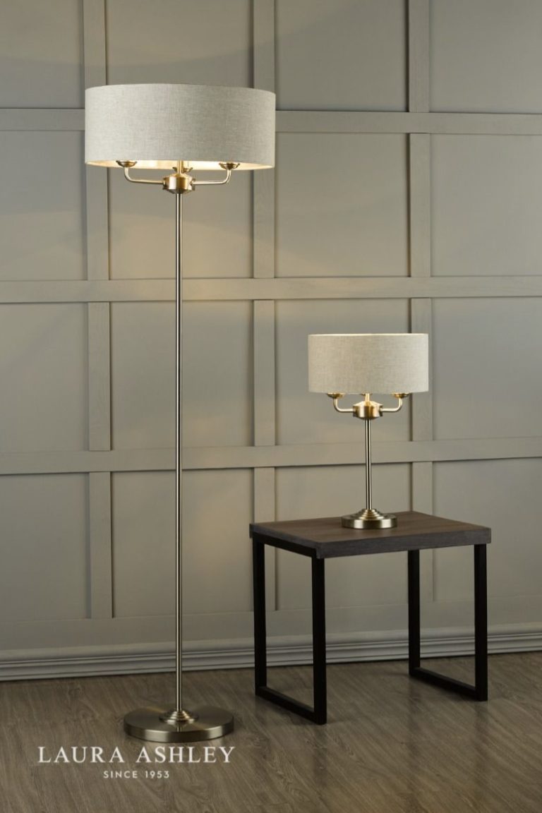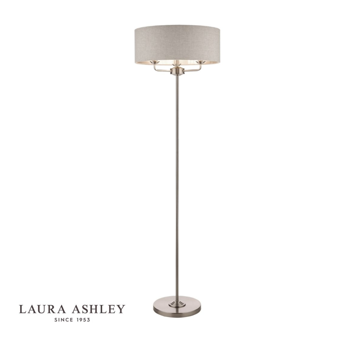 Chic and on-trend, the attractive Sorrento floor light from Laura Ashley boasts three lights on arms, all encased in a single contemporary drum shade in natural slubbed linen with a metallic silver inner. A straight stem rises up from a round, flat base with stepped, Art Deco style, detail. This triple light floor lamp comes in a velvety Satin Nickel finish, adding grown-up atmosphere to your dining or living area.