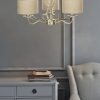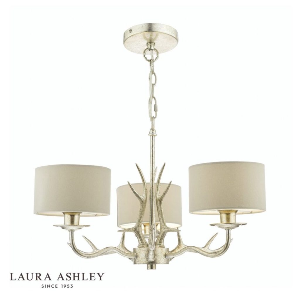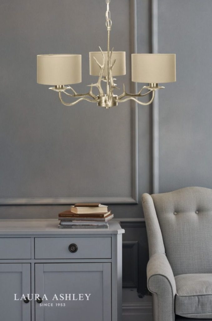 Make a statement with the Laura Ashley Mulroy 3-armed ceiling fitting, a beautifully crafted, candelabra style chandelier that makes a rather grand, country house statement. Featuring a resin antler design, this contemporary interpretation of a nostalgic style boasts a hand-finished shimmering antique champagne look for a touch of luxury. Shades in a sheened, natural colour fabric are included.