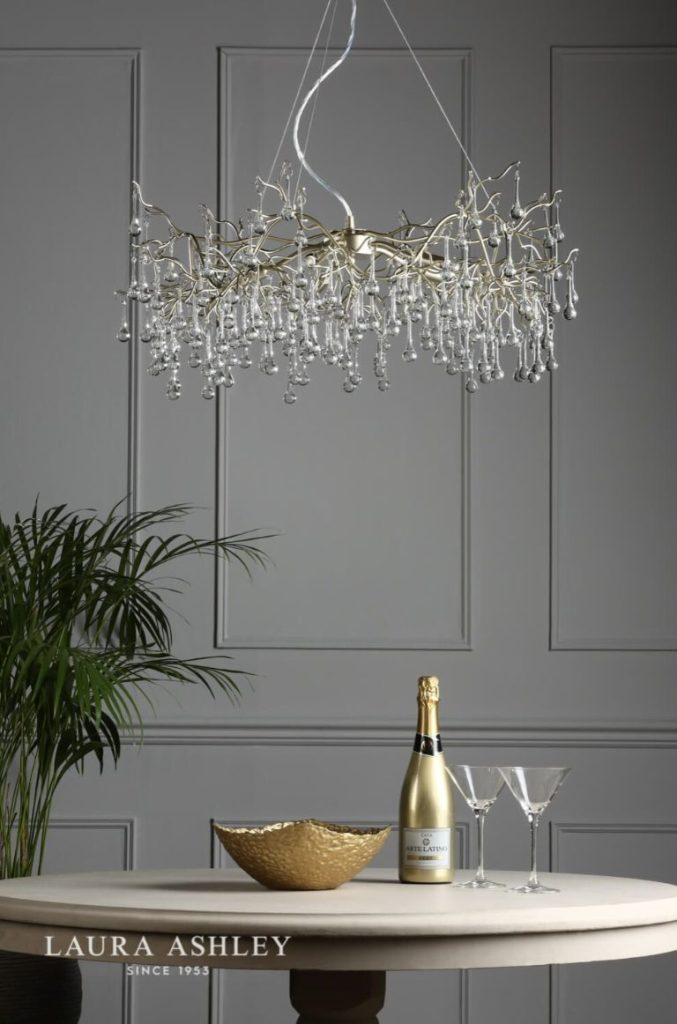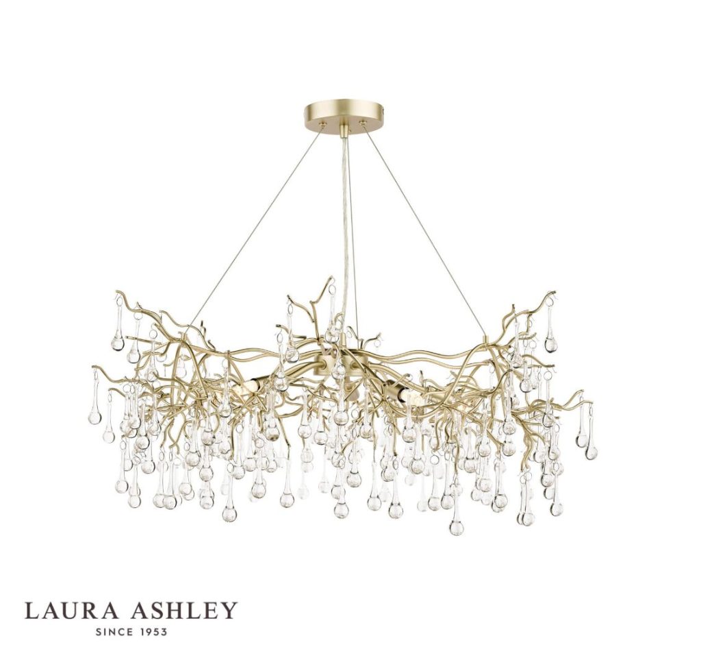 What’s not to like about this gorgeous contemporary chandelier with long crystal raindrops dripping from undulating willow branches? Painted in a soft gold with a satin finish, the Willow 5 light pendant ceiling light from iconic brand Laura Ashley is bright and pretty. This ceiling fitting has a matching finish ceiling rose and stem plus a discreet clear cable included.