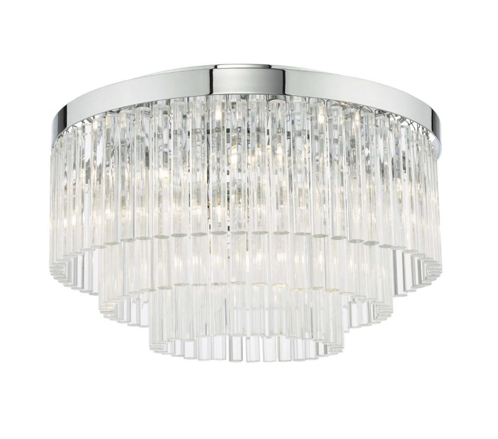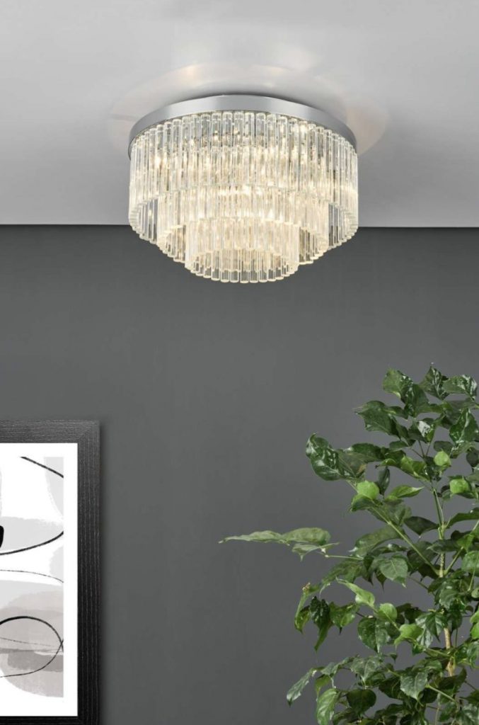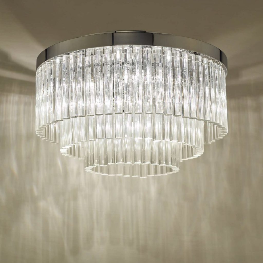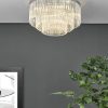 The Logan five-light semi-flush ceiling light in polished chrome is comprised of three tiers of clear crystal to give a modern take on the usual tiered chandelier.