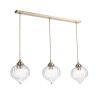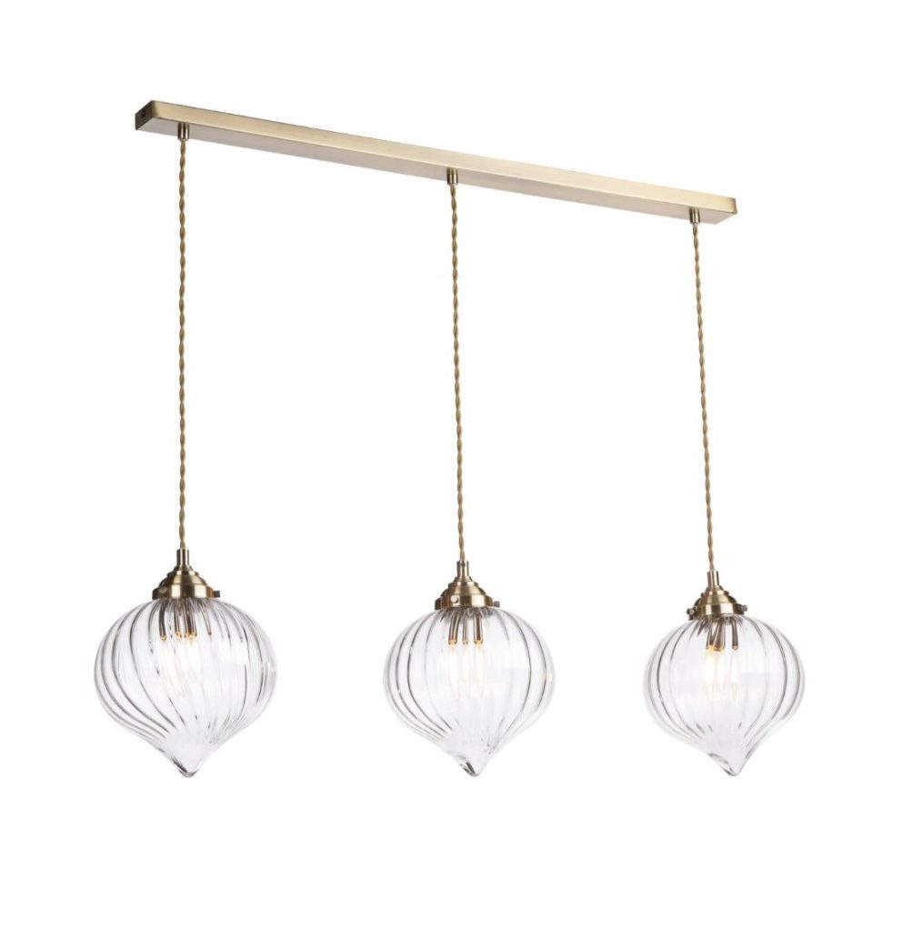 Quietly stylish and perfectly suited for a kitchen or dining room, the Mya 3 light bar pendant features a mouth-blown glass drop with a more contemporary soft waterfall ribbing, gently diffusing the light.