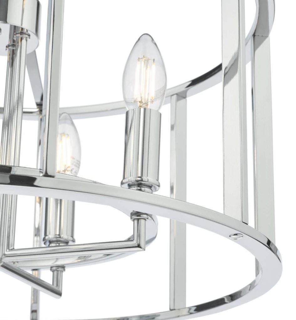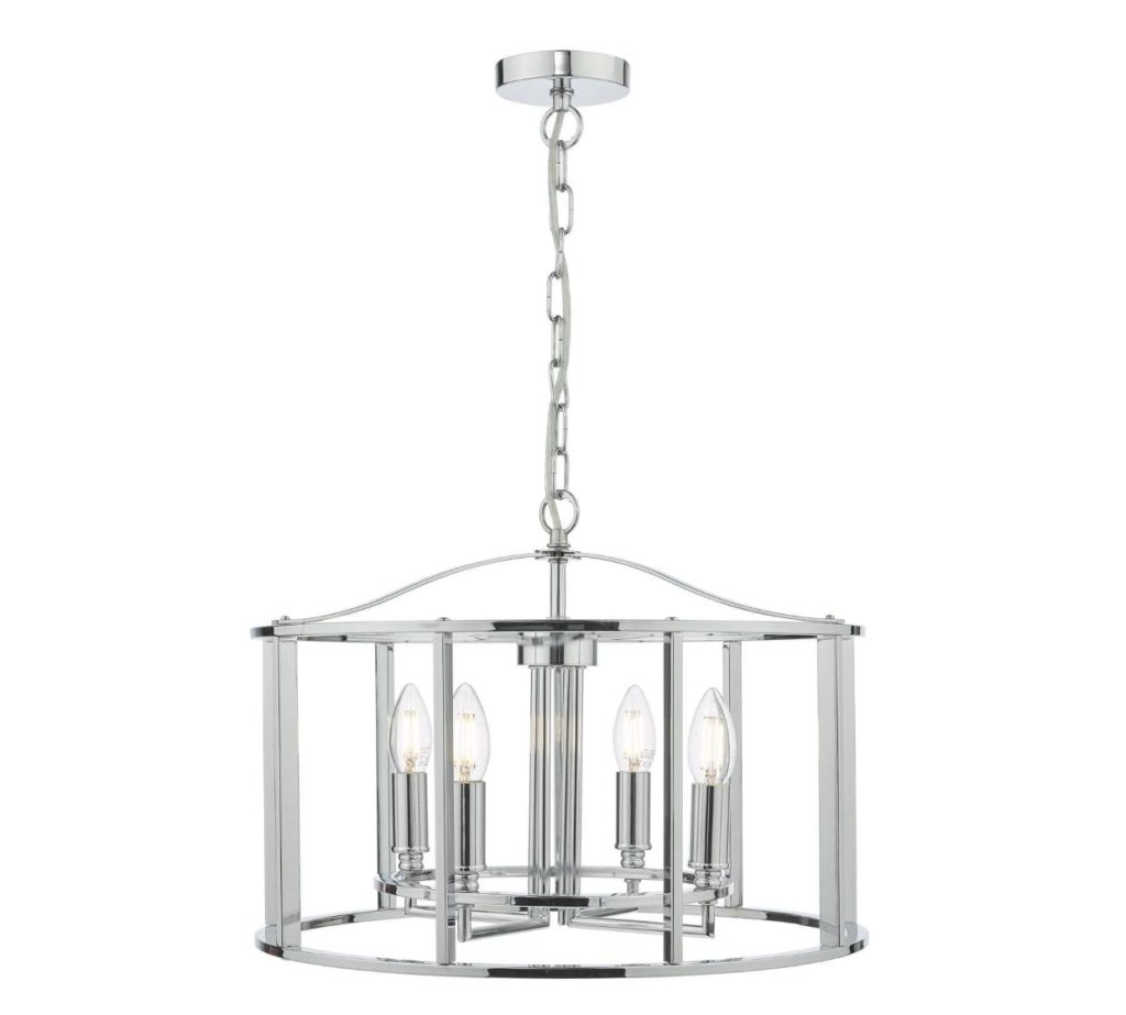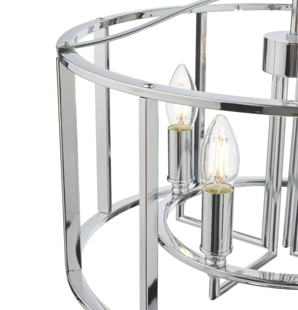 The Myka 4 Light polished chrome fitting encased in a decorative cage with a curved top. This fitting looks wonderful with our decorative filament candle lamps. Hung on 1m of matching chrome chain, height adjustable on installation.
