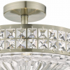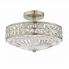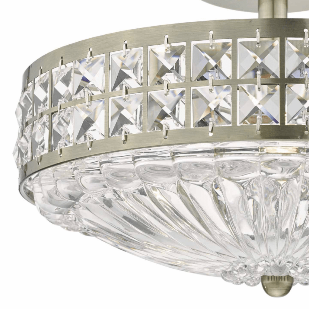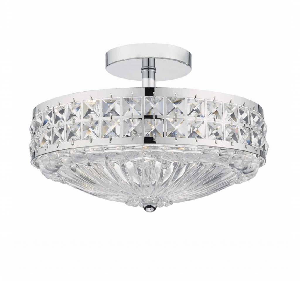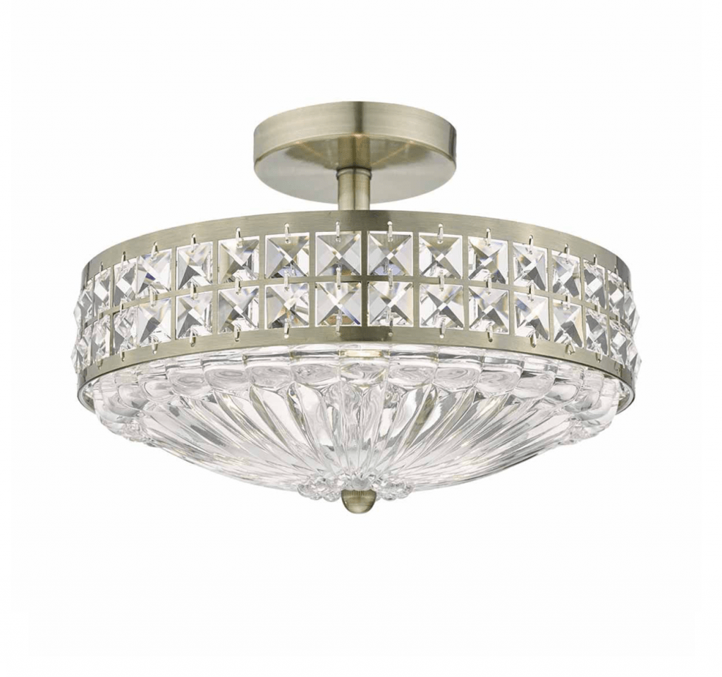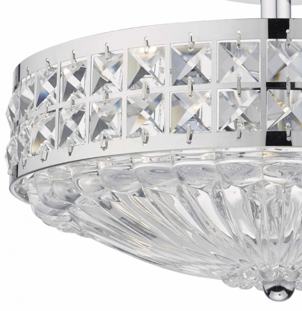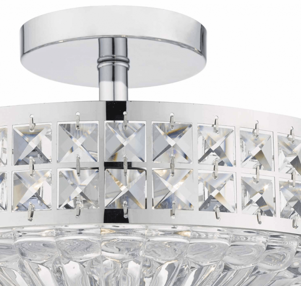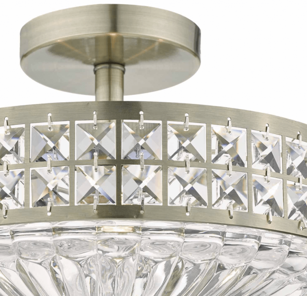 OLONA takes the traditional crystal ceiling flush and updates it with beautiful sparkling square faceted crystal beads mounted in a polished chrome or antique brass frame with a decorative clear glass diffuser.