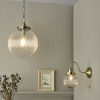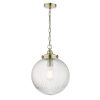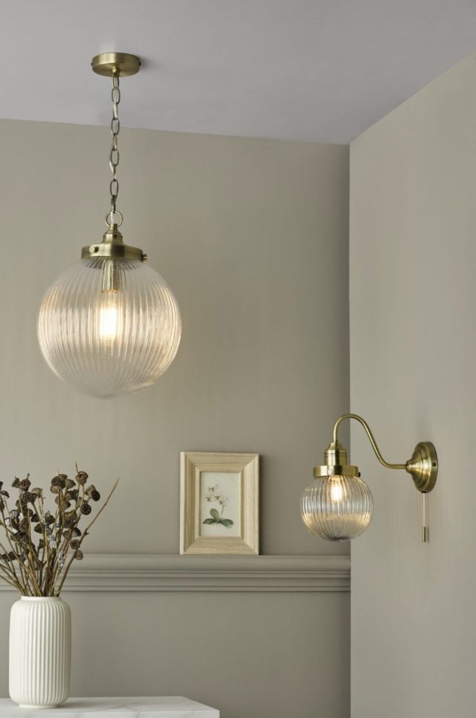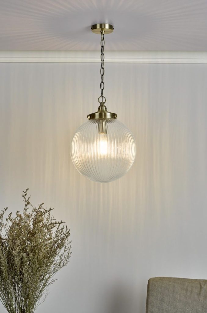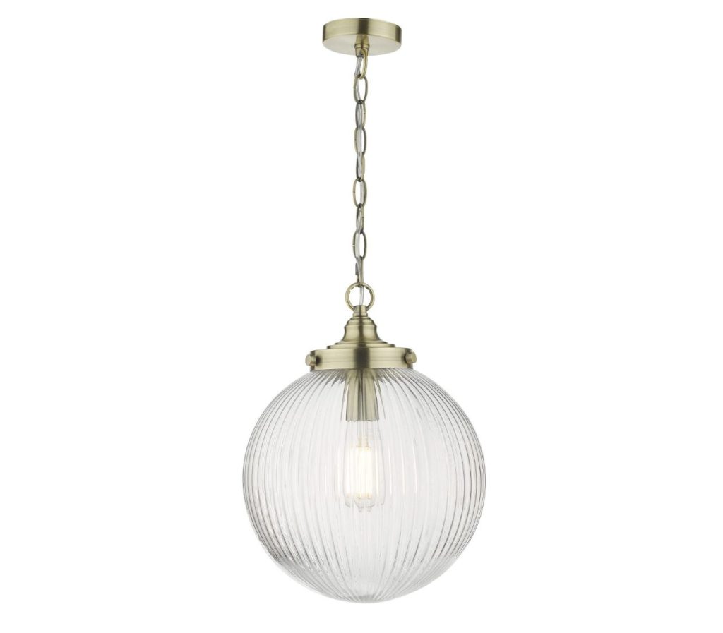 The Tamara single pendant features a globe-shaped ribbed glass shade paired with metalwork, including a hanging chain, with a warm antique brass finish. It is elegant ceiling light that would be equally at home in a French bistro or a country kitchen.