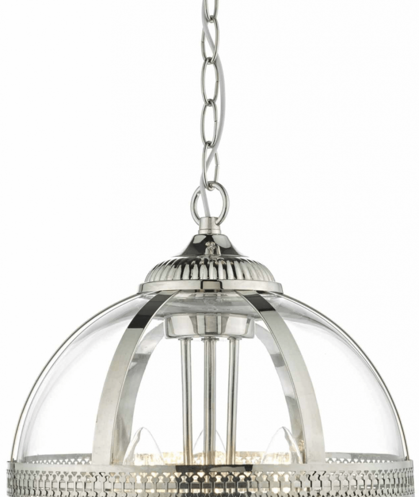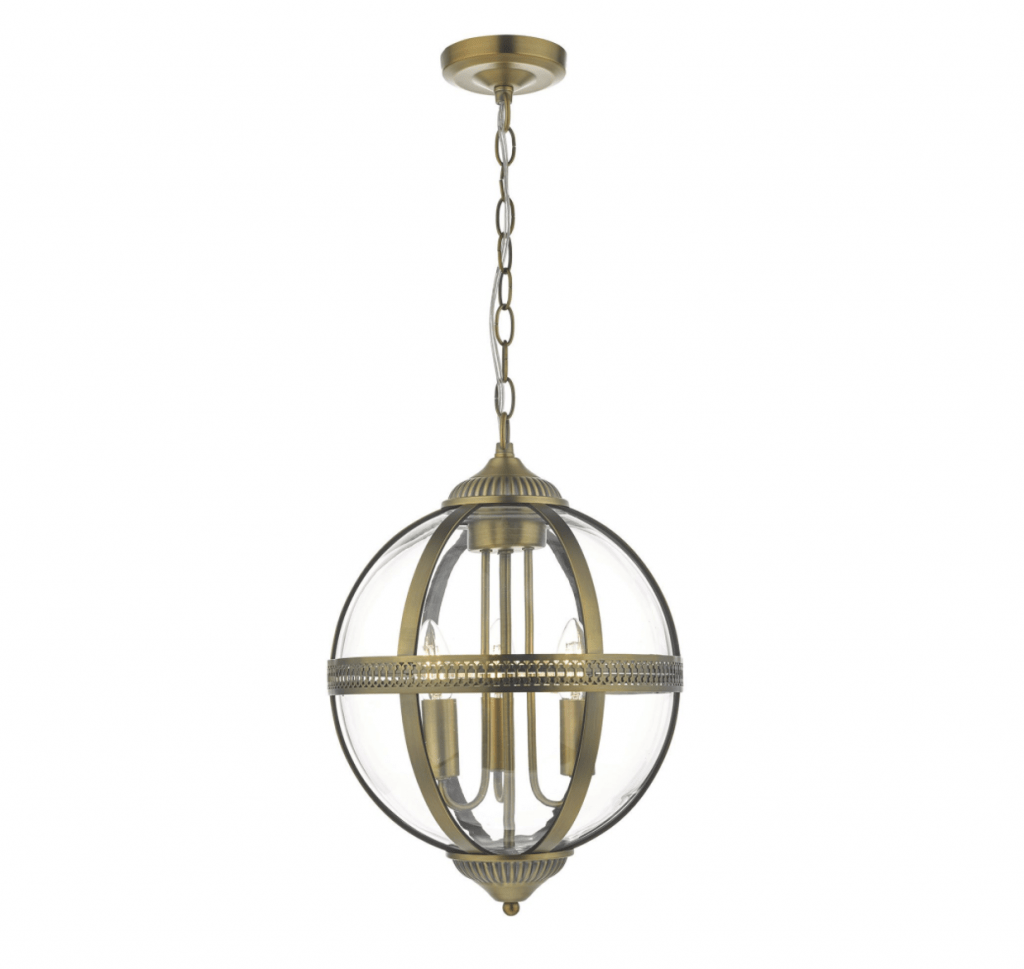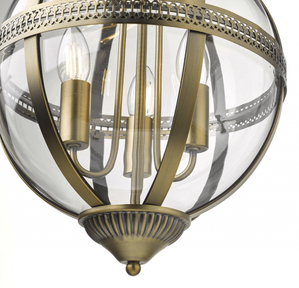 The Vanessa 3 light Lantern in an antique brass or polished nickel finish. A decorative pendant featuring a spectacular orb glass shade with intricate metal detailing. This fitting is height adjustable. An eye-catching fitting that would look fabulous in any living space.