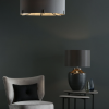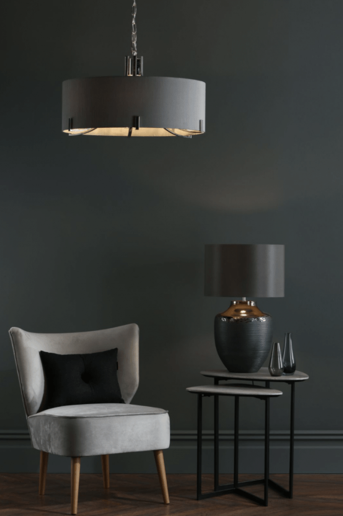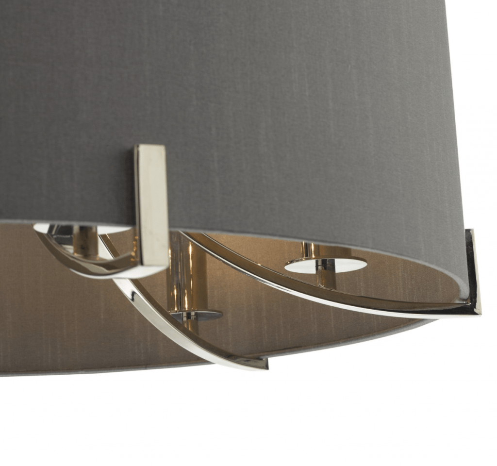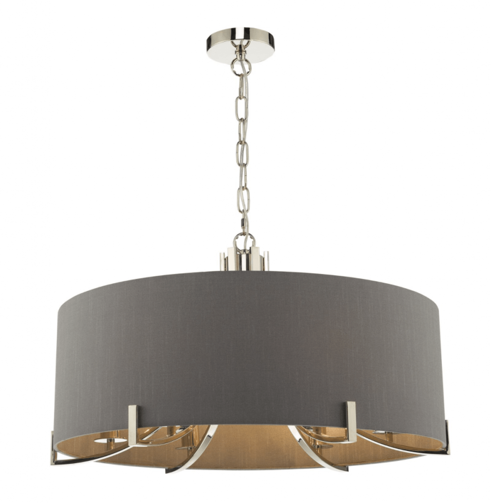 The Veyron 6lt pendant ceiling light in polished nickel with grey faux silk shade. 1m of chain is included which can be adjusted on installation depending on how low your ceiling is or how high you’d like to hang the ceiling light. The nickel plated arms sweep from the centre to clasp the shade from below.