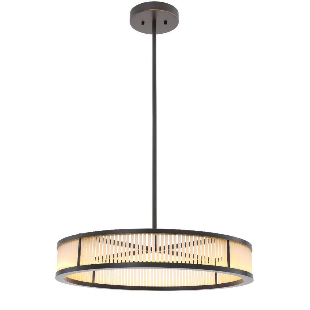 Thibaud is a marvelous minimalist ceiling lamp that works really well as a central light in living rooms, dining rooms and bedrooms. It features a drum-shaped shade with a bronze finish that is adorned with rods of frosted glass.