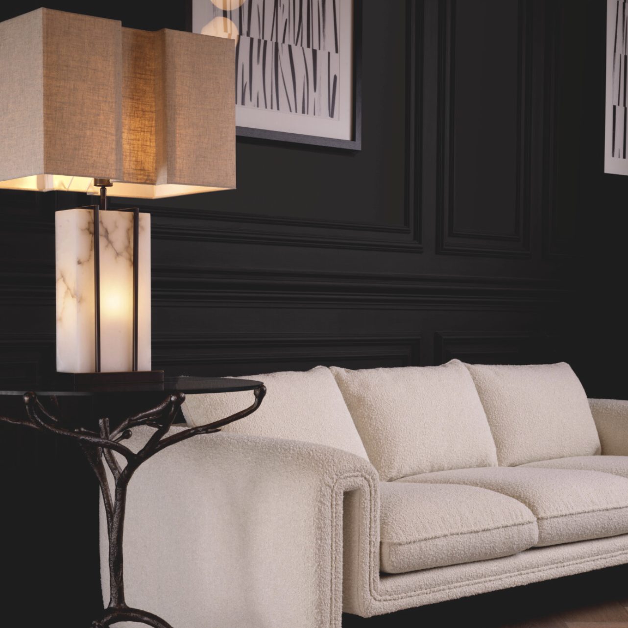 The Graham Table Lamp features an alabaster body in a bronze highlight finish frame and is supplied with a linen mix shade that has coves on both sides. The translucent alabaster body also contains a lamp socket and creates a really warm ambient light.