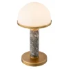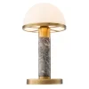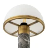 The Art Deco inspired table lamp consists of an antique brass base with a grey marble body and a dome-shaped lampshade of white glass.
