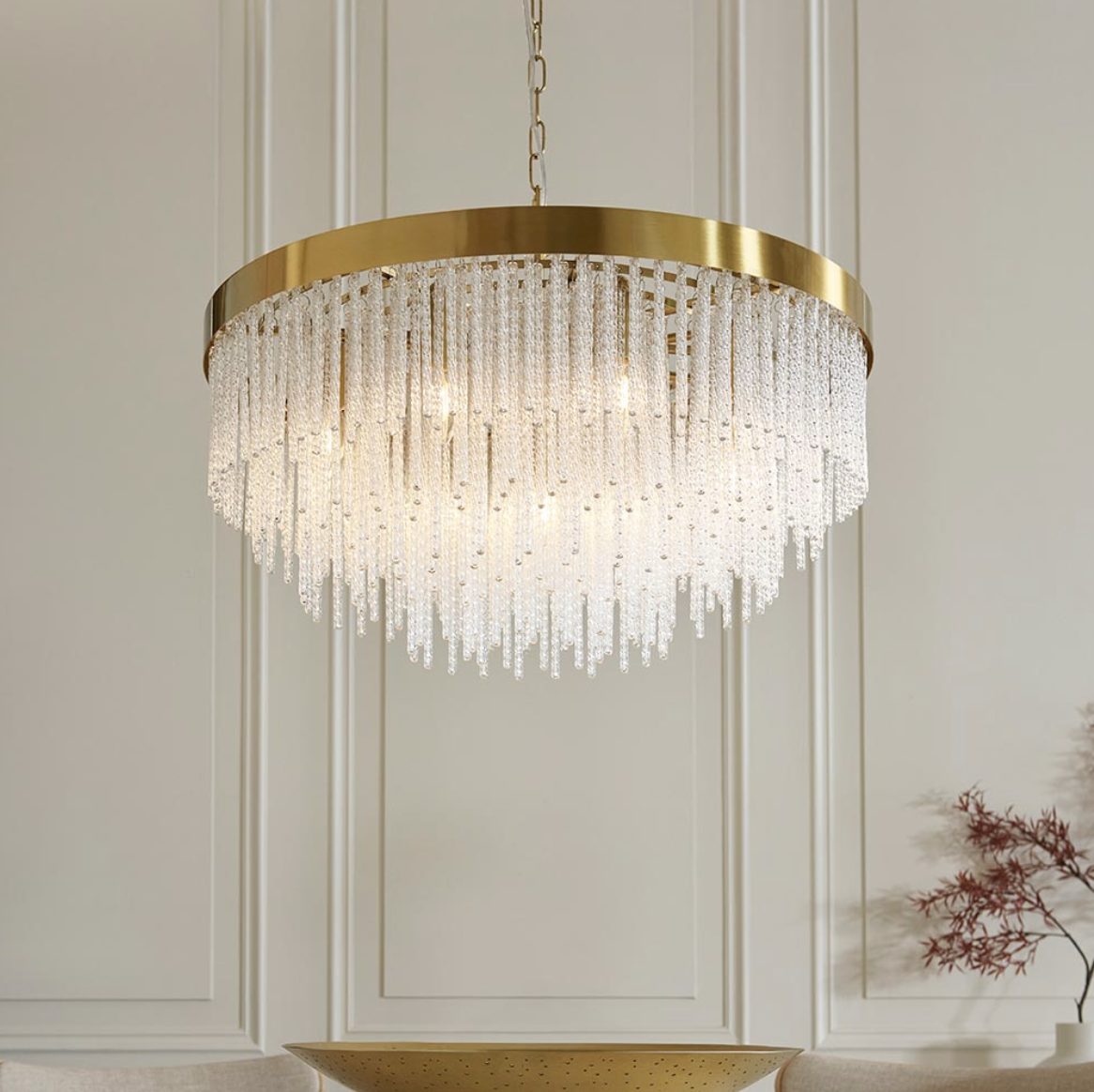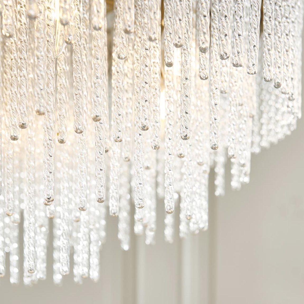 Make a bold design statement with this stunning 9-light ceiling pendant. Showcasing a luxurious warm brass finished frame and an intricate arrangement of textured glass rods, this fixture exudes glamour and elegance.