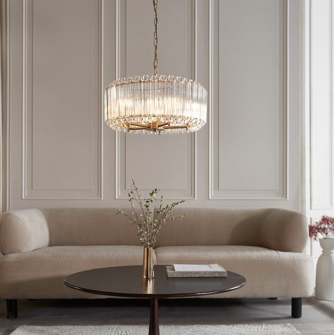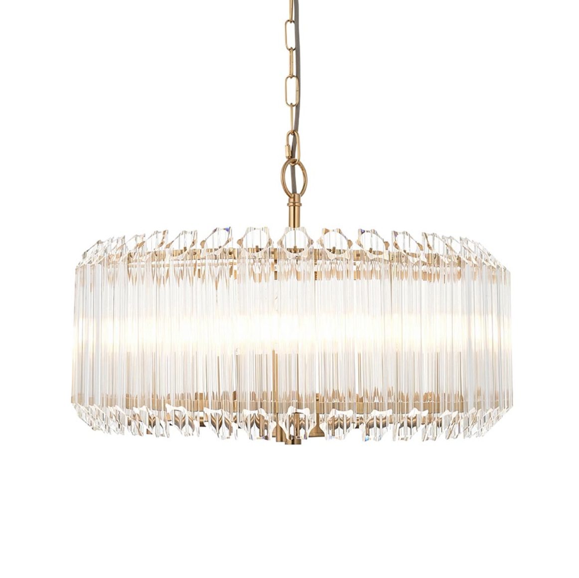 Add a touch of refined glamour to your space with this elegant 5 light pendant, suspended from a height-adjustable chain set with grey braided fabric flex. The pendant features a stunning arrangement of vertically cut clear crystal rods, creating a luxurious faceted silhouette that diffuses light beautifully. Its warm aged brass metalwork adds a timeless richness, making it a statement piece perfect for dining rooms, living areas or entrance halls.