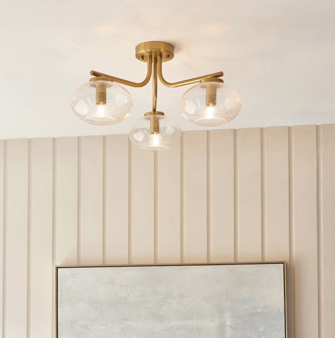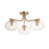 Blending classic curves with modern simplicity, this 3-light semi-flush ceiling fitting features softly rounded arms in a warm brass finish and hand-blown clear bubbled glass shades.