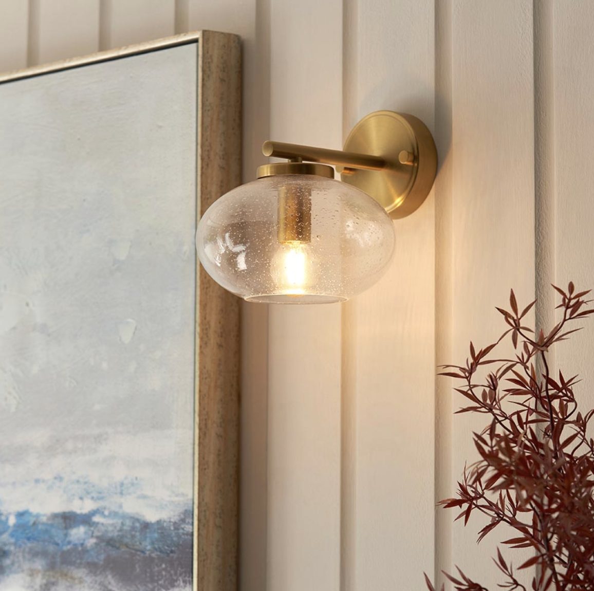 Blending classic curves with modern simplicity, this single wall light features a linear arm in a warm brass finish with a hand-blown clear bubbled glass shade.