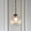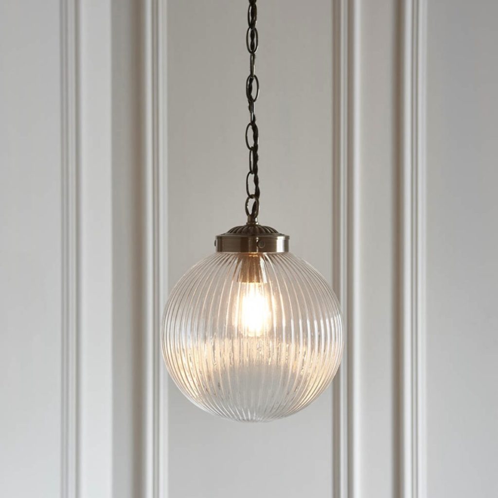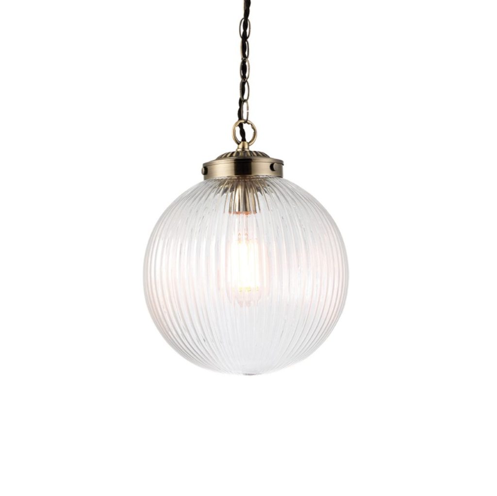 The Brydon ceiling pendant features a ribbed round glass shade hanging from a decorative chain finished in antique brass. Compatible with LED lamps, this fitting can also be dimmed.