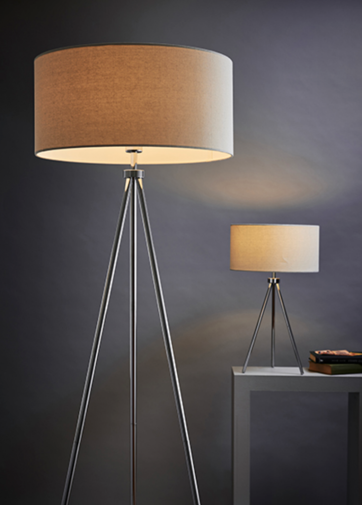 A simple yet stylish floor light in a tripod design with a chrome effect finish, and teamed with an ivory linen effect shade.