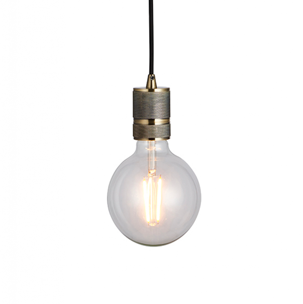 This industrial cable set is finished in smart black chrome or antique brass plated metal with authentic machined details. Suspended from height adjustable black fabric flex. The perfect carrier for filament LED lamps to create that stylish exposed lamp look.