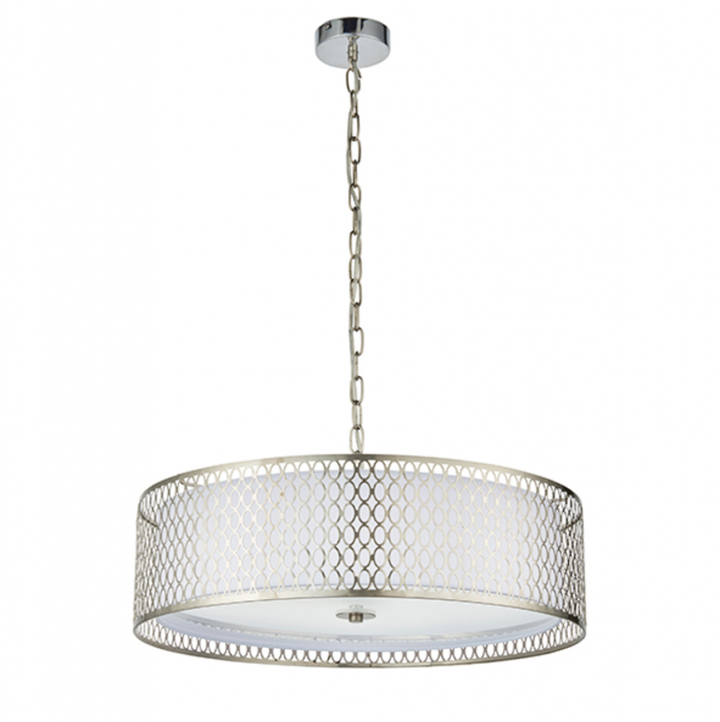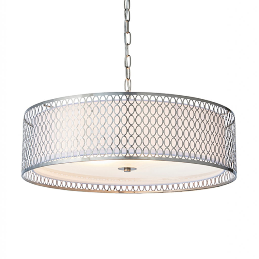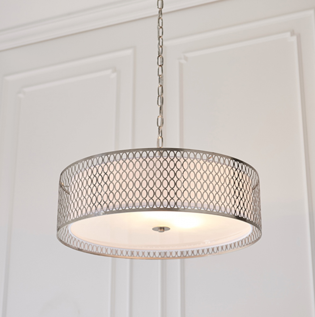 The Cordero is a classic circular light with a trendy geometric fretwork metal outer and an inner fabric shade for lovely light diffusion. Height adjustable rope chain.