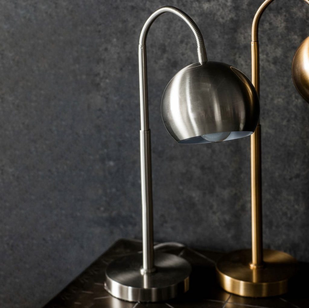 Impressively sized and on trend table lamp with a fully flexible arm, finished in brushed chrome. In-line switch detail on black fabric flex, compatible with LED lamps.