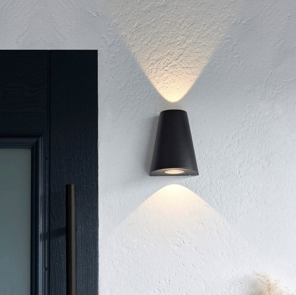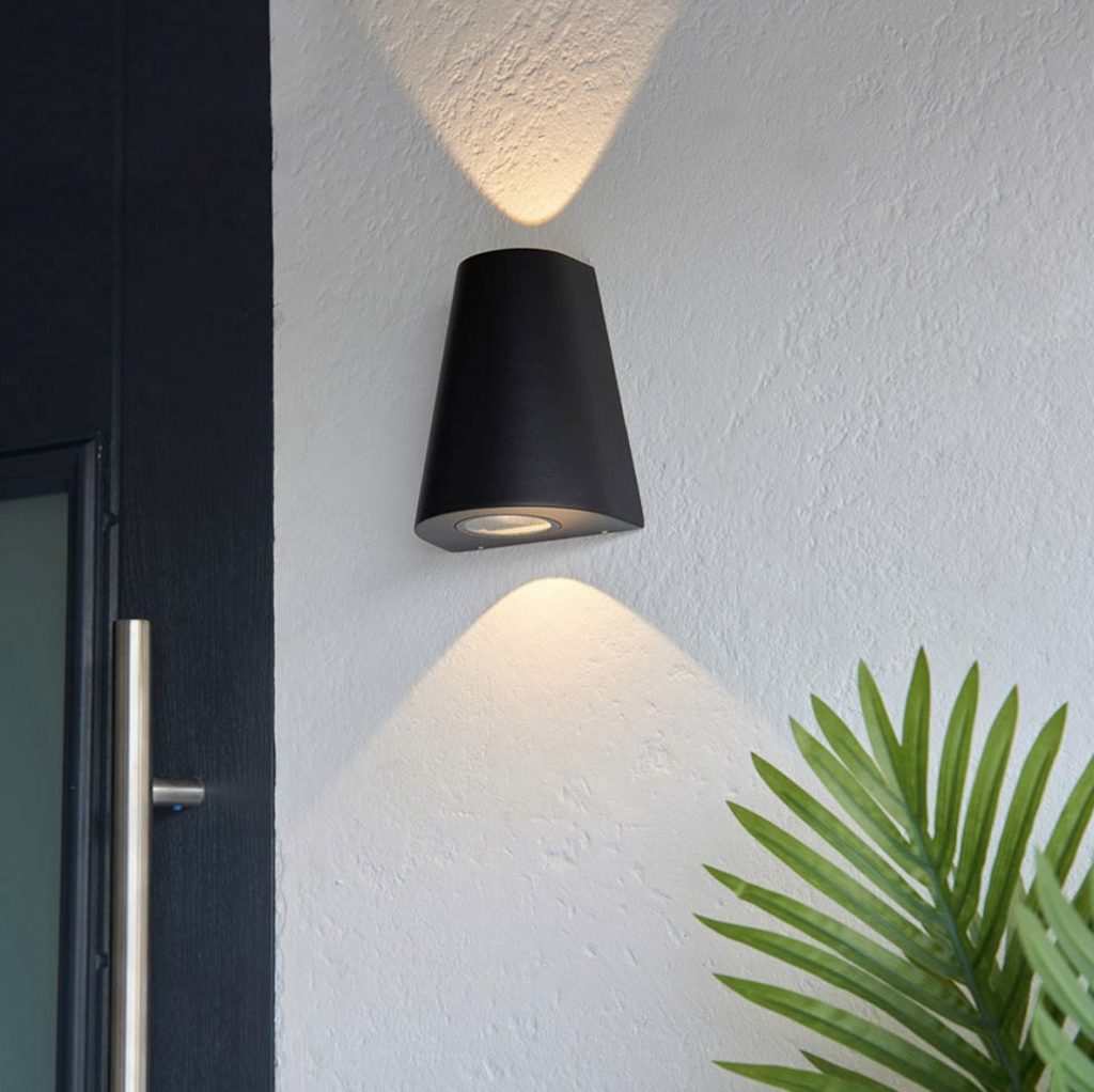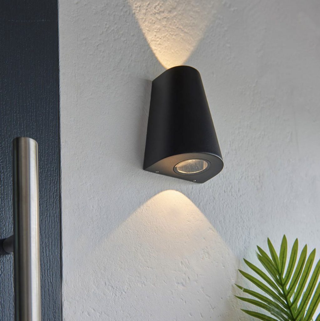 Modern exterior wall light in textured black finished metal work. Corrosive resistant this is a hardwearing wall light to add sophisticated light to the outside of your home.