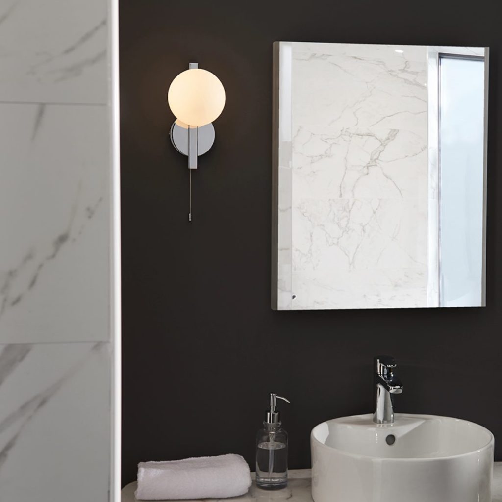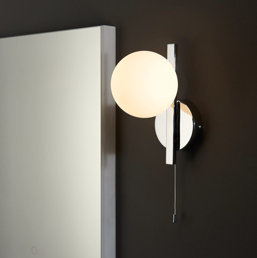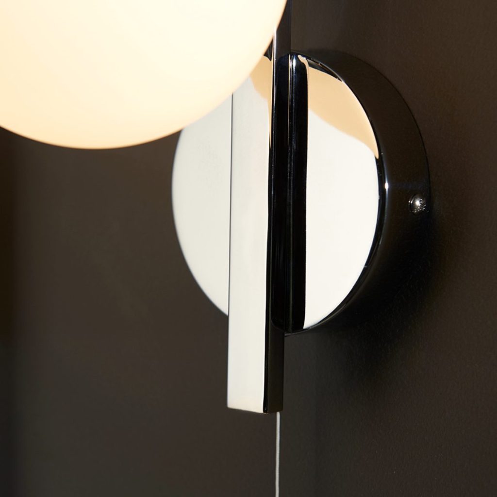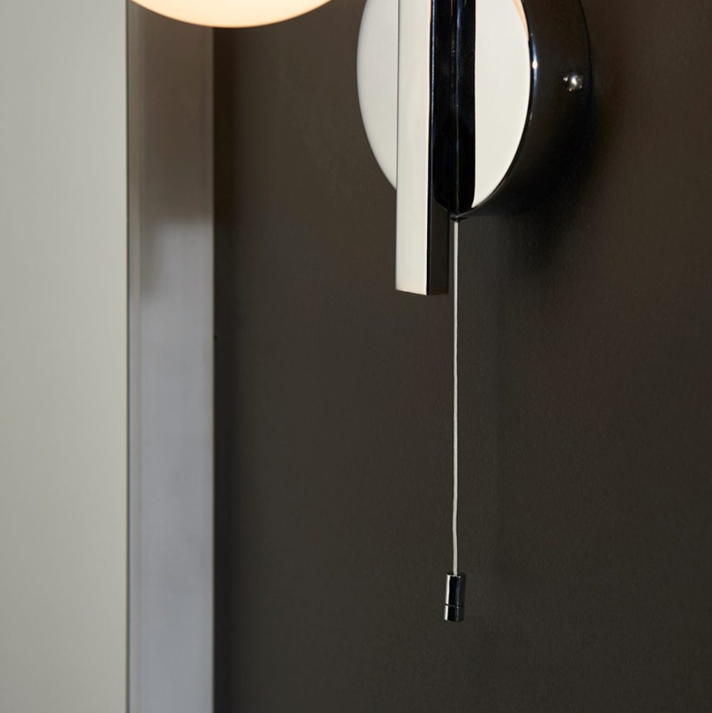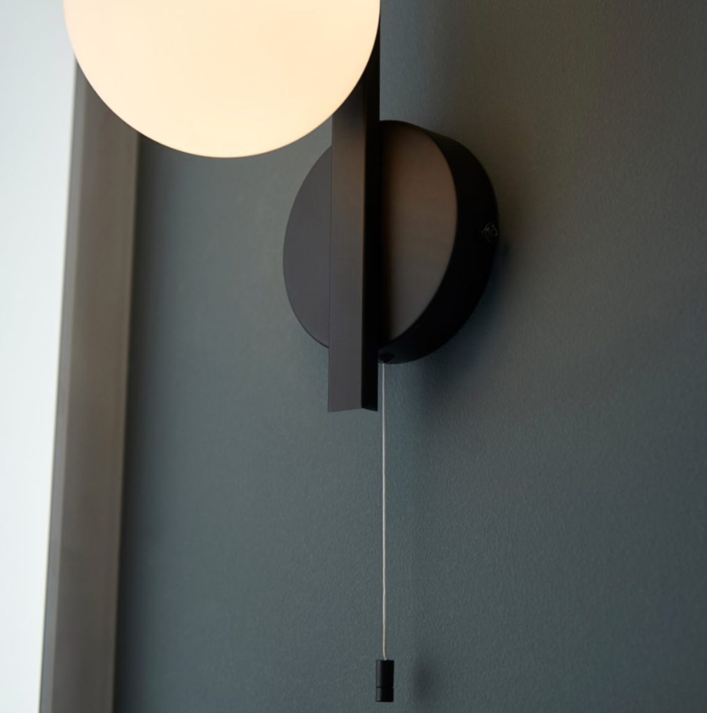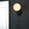 Contemporary Matt Black or Chrome right angle wall light. Painted metalwork. Matt opal sphere glass shade. Easy reach on/off pull cord switch.