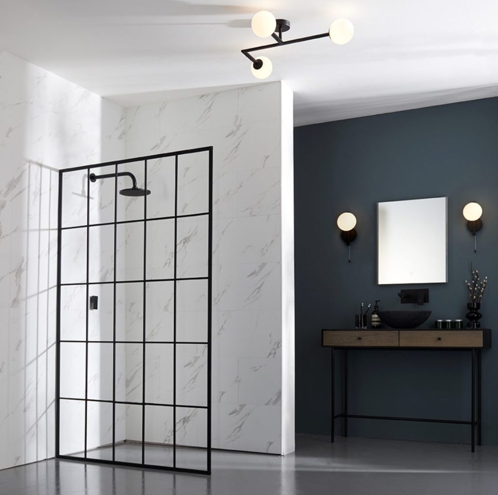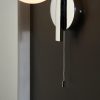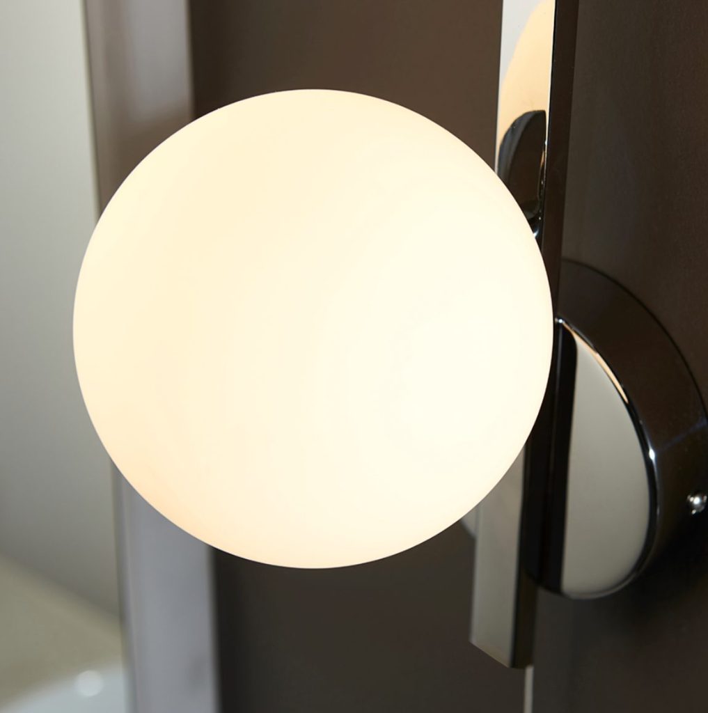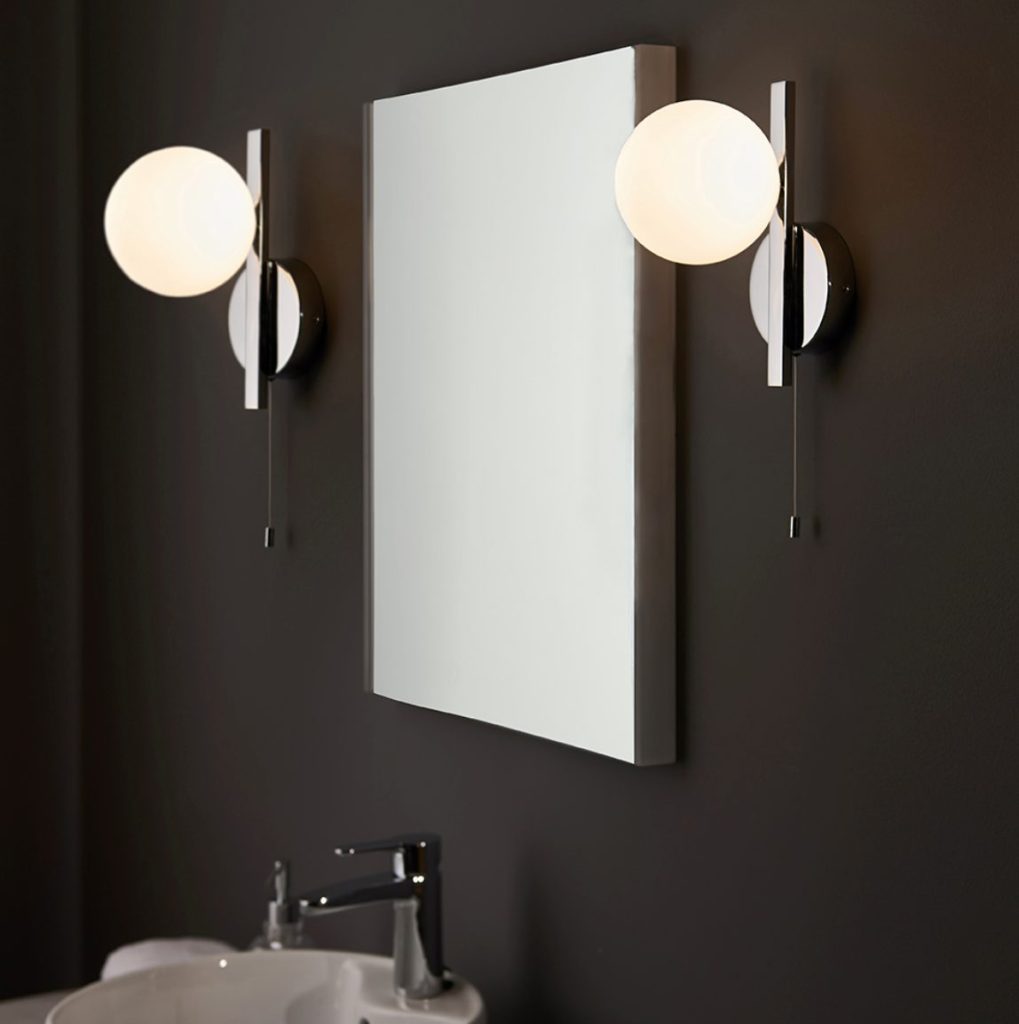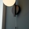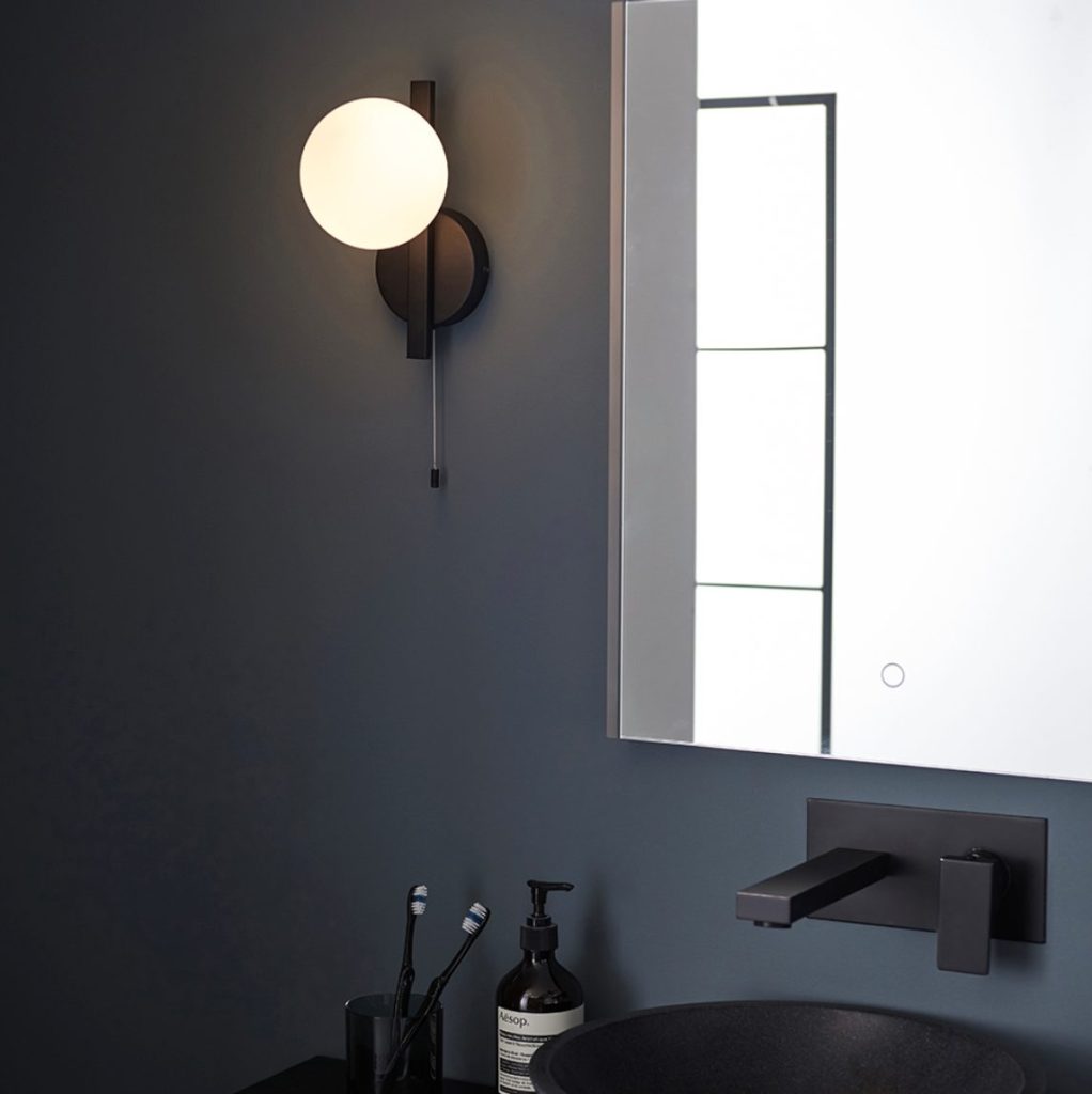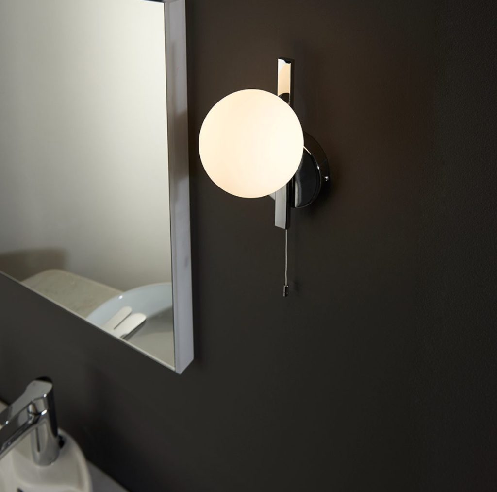 Contemporary Matt Black or Chrome right angle wall light. Painted metalwork. Matt opal sphere glass shade. Easy reach on/off pull cord switch.