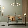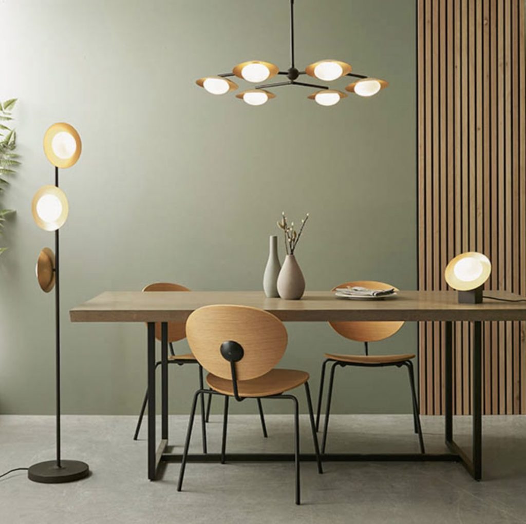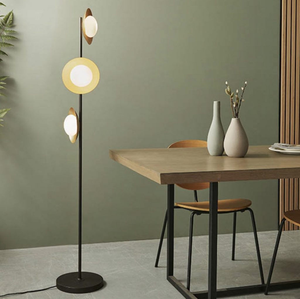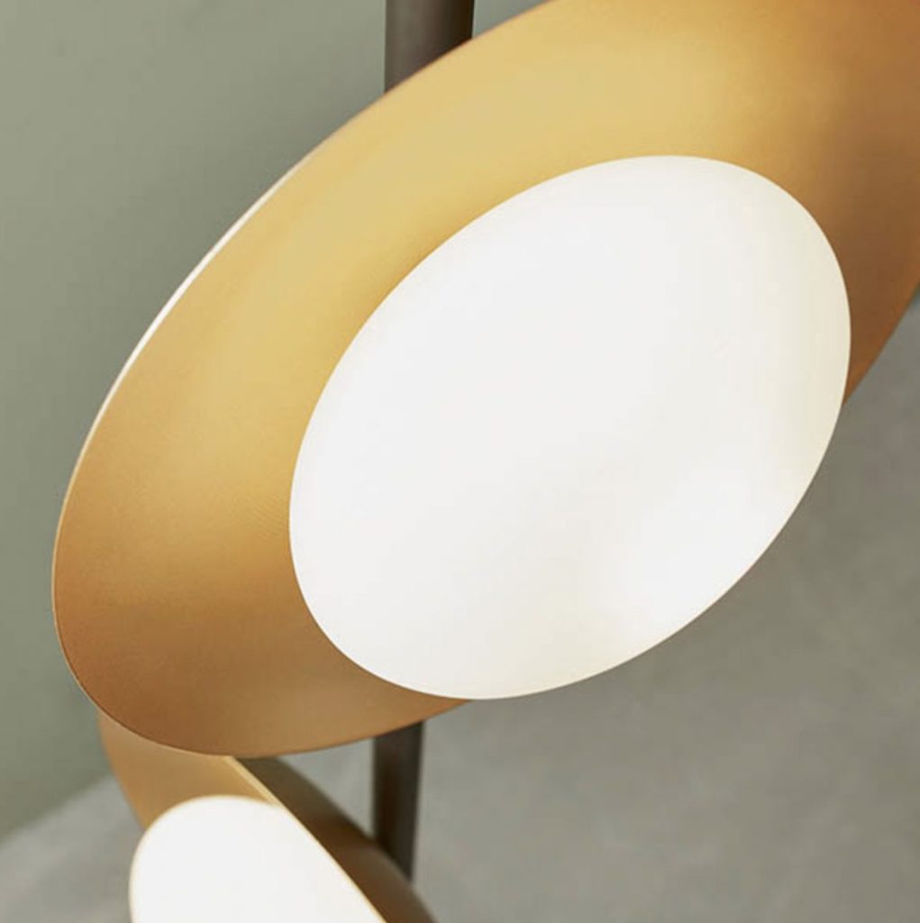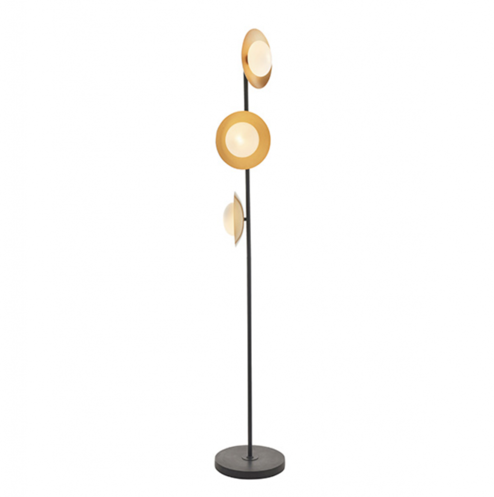 Gold and dark bronze finished metalwork Dish floor lamp with pebble shaped opal glass shades. In-line on/off foot switch with 2 metre black flex.